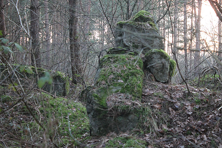 Decke und Wände großteilig zerstört / Trümmer großteilig beseitigt / augenscheinlich nur Eingangswände links und rechts teilweise erhalten / augenscheinlich Rest zumindest eines Lüftungsschornsteines erhalten / Erdum- überböschung in Ansätzen erhalten