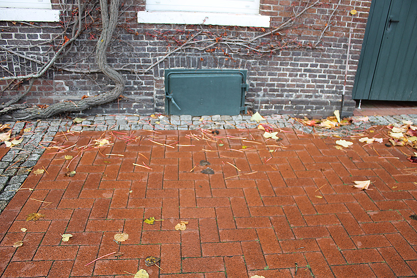 Links neben der Schutzklappe ist ein weiteres Kellerfenster im vermauerten Zustand zu sehen. Auch dahinter befand sich der LS-Kellerbereich.