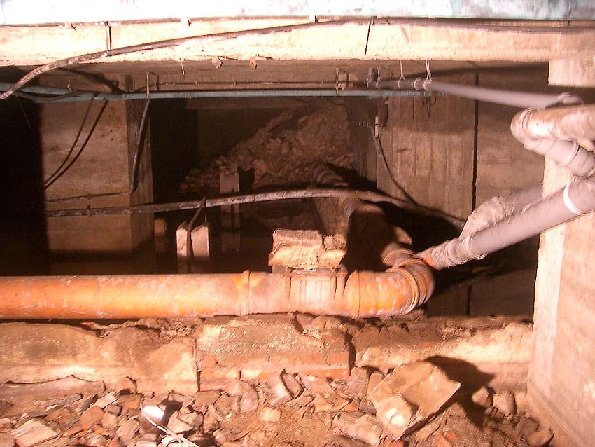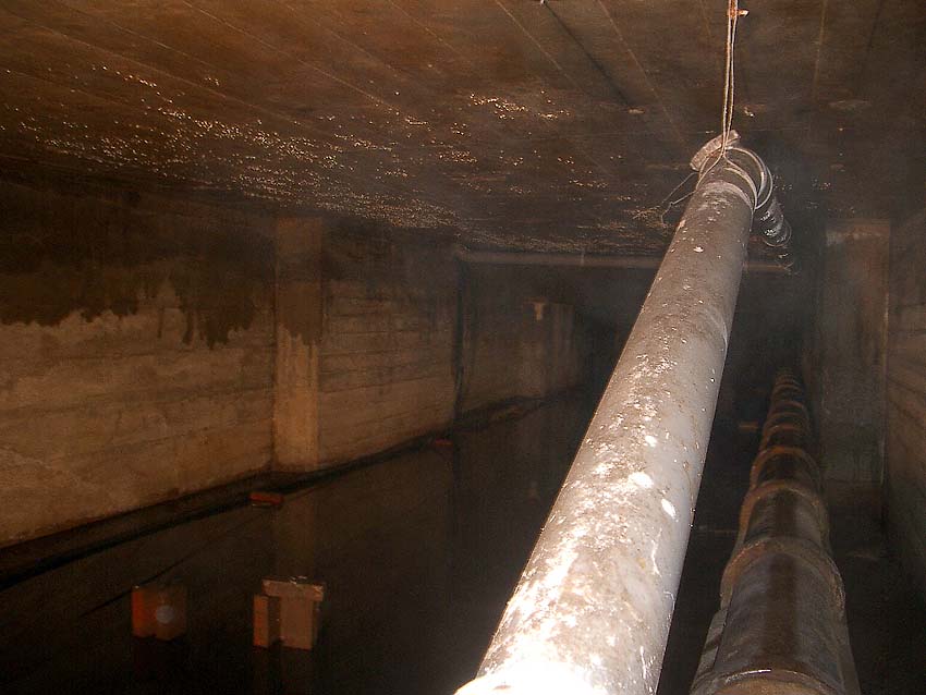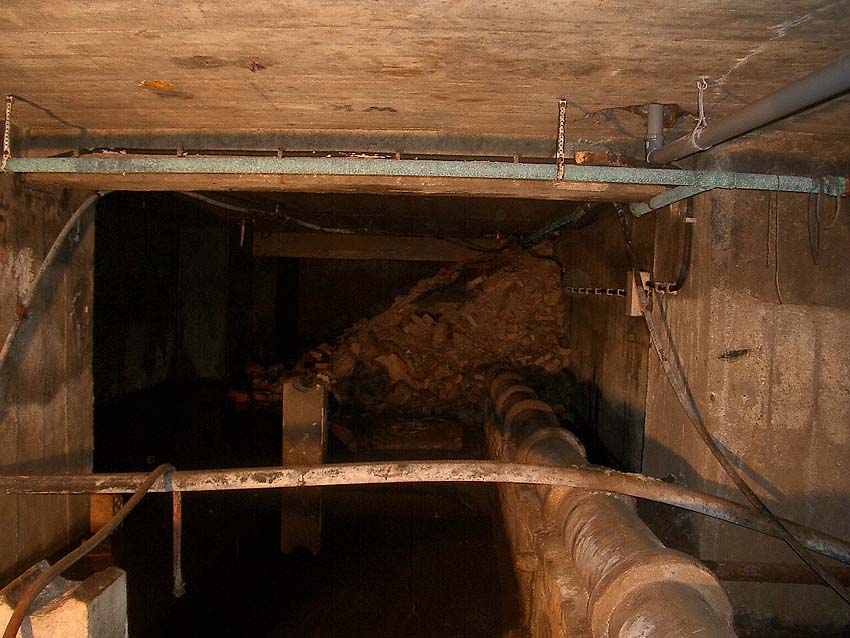Das Innere des Ostbereiches der Anlage direkt unter dem östlichen heute abgetrennten Gebäudebereich / Hallenbereich. Ein halbkellerartiges Geschoss unter Erdgleiche. Eine Art Kriechkeller mit 1,80 Metern Höhe, hier liefen innerhalb der angelegten Versorgungssystemverbunkerungen unter anderem Versorgungsleitungen für den westlich gelegenen Schnürboden und seinen wohl jedoch nicht bombensicheren Tiefbunker zusammen. Der Hauptgang erstreckt sich mittig des Komplexes unter der gesamten Fläche von Westen direkt vom Bunker aus nach Osten. Ob hier in diesem Bereich in späten Kriegstagen auch Menschen Schutz suchten, bleibt ungewiss. Die Gänge boten auf jeden Fall Splitterschutz sowie Trümmerschutz. Teile stehen heute unter Wasser.