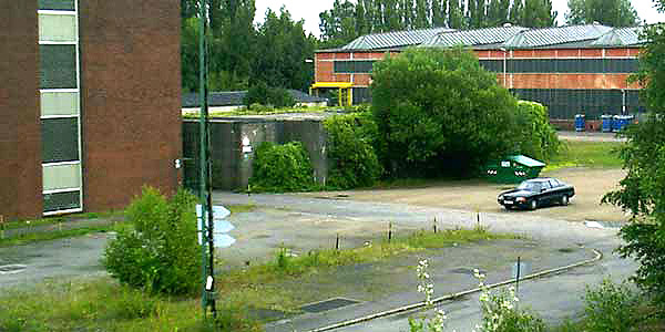 Ein sehr wahrscheinlich rechteckiger Hochbunker mit Splitterschutzvorbau im Werksgelände am Hasepark...