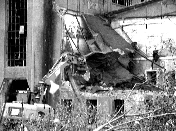03.12.14: Südzentrale: ABRISS. Heute wurde - wie befürchtet - mit dem Abriss begonnen bzw. der seit Monaten schleichend laufende Prozess der Zerstörung wurde fortgesetzt. Der kleine Anbau nördöstlich an der Maschinenhalle wurde bis auf den Erdgeschosssockel vernichtet. Danach wurde das Unterfangen jedoch wieder gestoppt. Scheinbar sollen nächste Woche noch einmal Gespräche zwischen Verein und Eigentümern stattfinden. Ist das nun das Ende der Südzentrale? In der Tagespresse - Südzentrale: Abriss vorerst gestoppt
