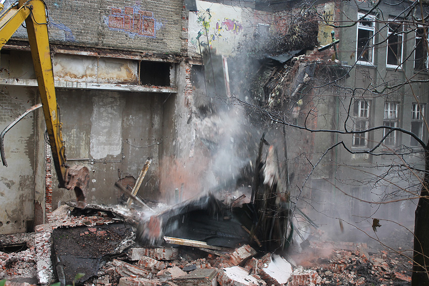 06.11.14: Vor zwei Tagen rückten wieder Bagger und weiteres Räumgerät an der Südzentrale an. Zusätzliche Container wurden aufgestellt. Gestern wurden dann die asbesthaltigen Wandplatten am nördlichen Nebenbau der Südzentrale Stück für Stück abgetragen. Nicht ohne Folge. Dreimal rückte die Polizei laut Aussagen mehrerer Bürger an, um die ordnungsgemäße Handhabung der Schadstoffrückbaumaßnahme zu kontrollieren. Das ist heute in der Tagespresse zu lesen: