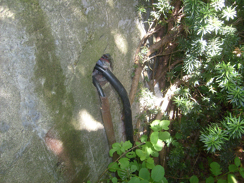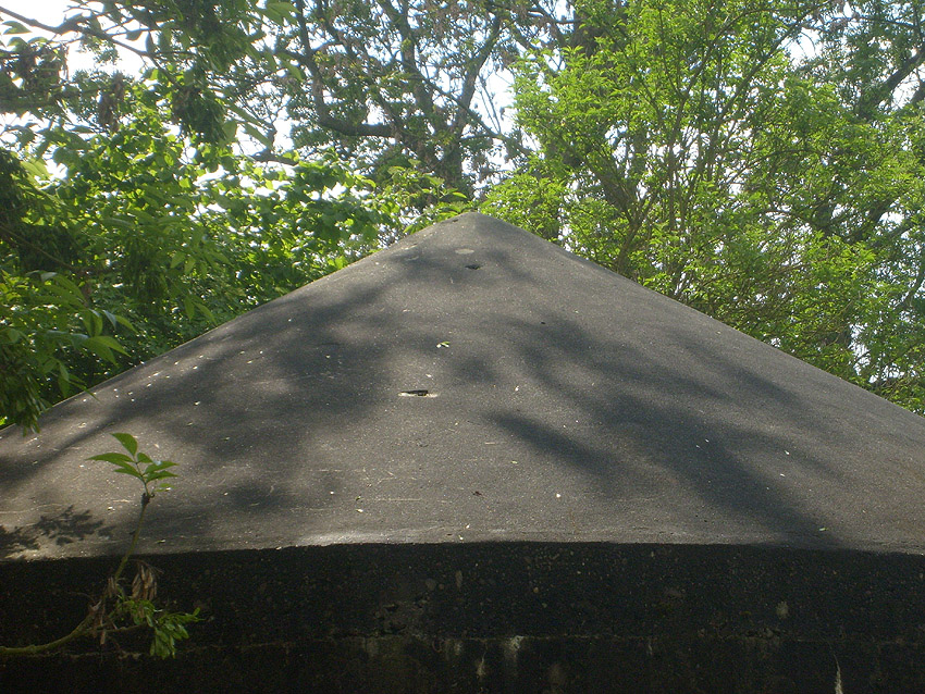 Der Betonblock im Notausstiegsbereich ist von allen Seiten verschlossen. Entweder wurde er nachträglich vor den Ausstieg gesetzt (unwahrscheinlich), oder ein, bzw. zwei seitliche Ausstiege wurden nach dem Krieg zugemauert und verputzt. Davon ist allerdings nichts mehr erkennbar... Ehemalige Öffnungen lassen sich höchstens erahnen. Oder befand sich im Block direkt vorne an der Längsseite eine Öffnung?