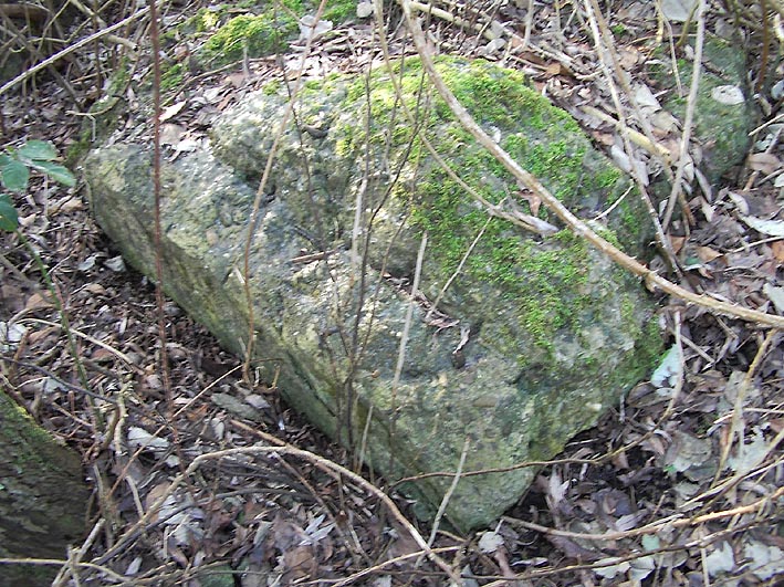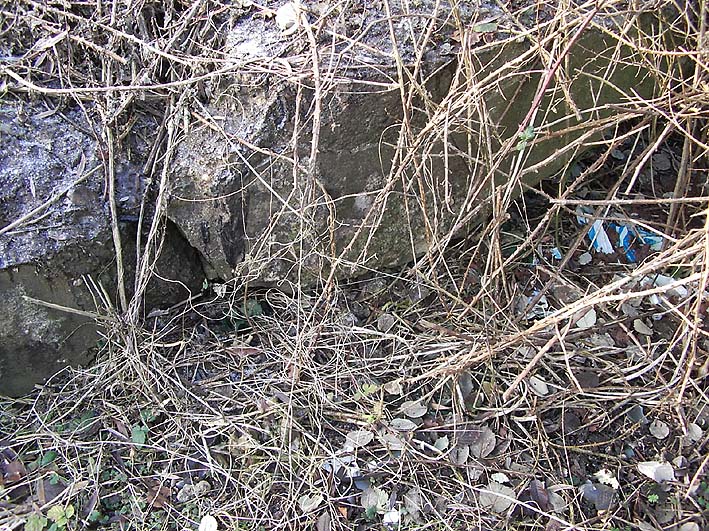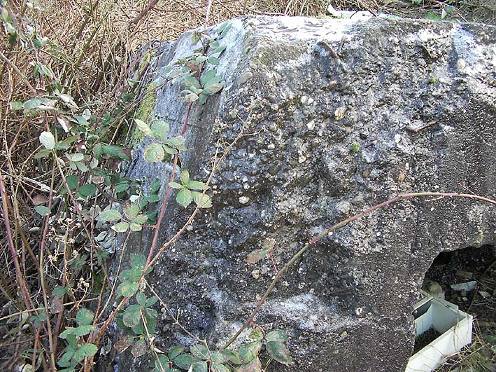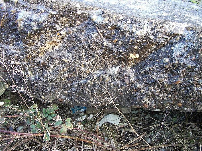Das einzige große erhaltene Trümmerstück auf der Fundamentplatte / Zerschellerplatte muss aus dem Inneren des Turmes stammen, vielleicht Teil einer Decke / Trennwand? Es könnte auch sein, dass dies die innere Prellwand der Gasschleuse eines der Eingangsbereiche war. Die Wand wäre dann aus dieser Blickrichtung nach vorne auf den Boden gekippt. Das Trümmerstück entspricht in seiner Tiefe einer Geschosshöhe...
