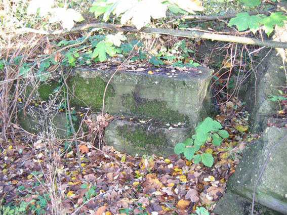 Unter dem zweiten Pfeil von rechts die Kuppel des gesprengten Turmes. Die Reste der (Rund)Türme 3 und 4 waren hier bereits scheinbar großteilig entfernt (größerer Bildausschnitt nach links hin liegt vor). Dies dürfte damit zusammenhängen, dass diese spärlicher bewehrt waren und die Trümmer somit leichter beseitigt werden konnten. Auch die Sprengung selbst dürfte diese Türme in kleinere Trümmer zerborsten haben, als die anderen Exemplare im Banter Lager.