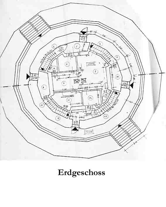 Unter dem Pfeil rechts die Kuppel des gesprengten Turmes. Die Reste der (Rund)Türme 3 und 4 waren hier bereits scheinbar großteilig entfernt (größerer Bildausschnitt nach links hin liegt vor). Dies dürfte damit zusammenhängen, dass diese spärlicher bewehrt waren und die Trümmer somit leichter beseitigt werden konnten. Auch die Sprengung selbst dürfte diese Türme in kleinere Trümmer zerborsten haben, als die anderen Exemplare im Banter Lager.