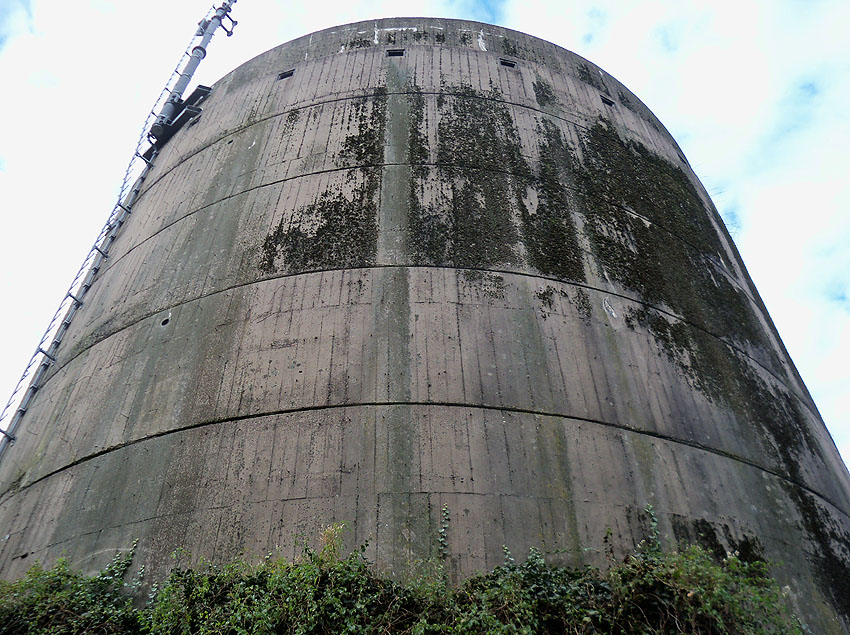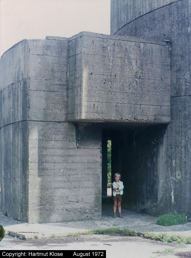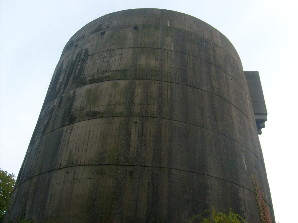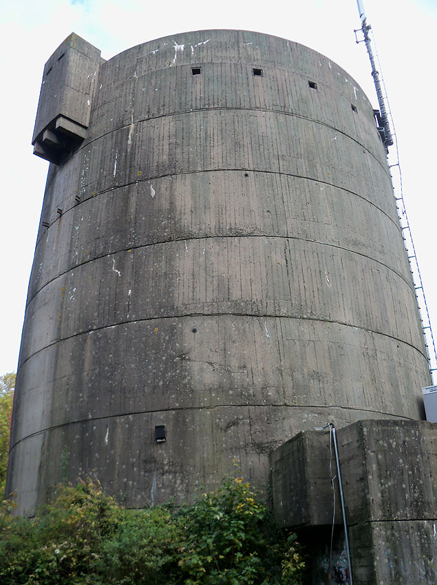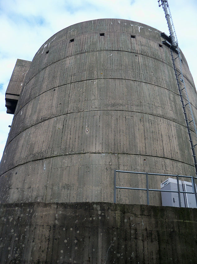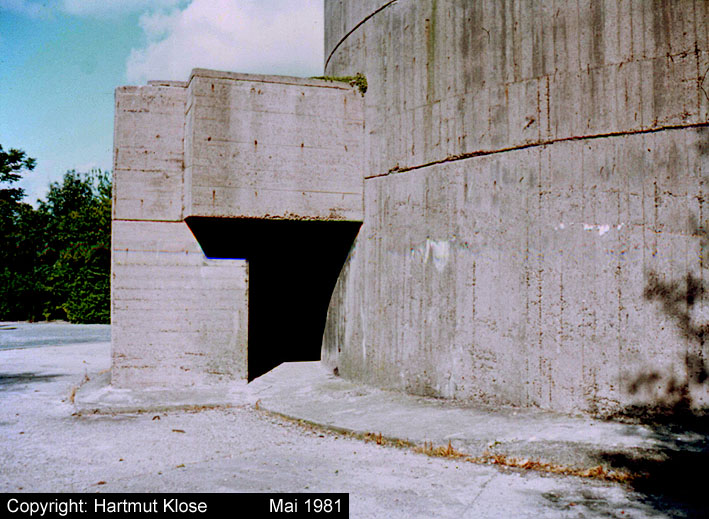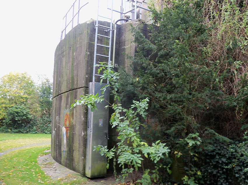 Nur die Außenhülle des Turmes ist intakt, er wurde von innen gesprengt. Alle vier Eingänge der Splitterschutzvorbauten sind vermauert.