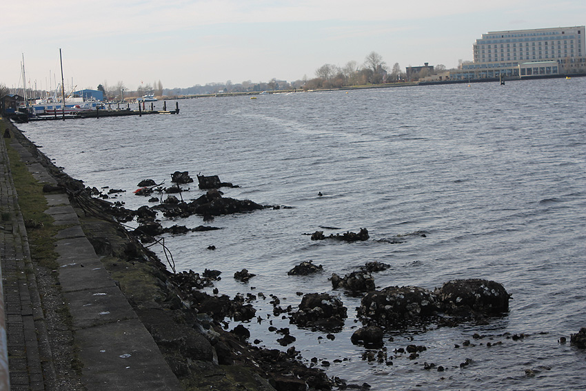 Trümmerstücke der alten Kaimauerbefestigungen / hier war das Westende der 1945 noch existenten Bereiche der Seydlitzbrücke. Eventuell auch einige durch Sprengung hierhin katapultierte Reste vom Bunker, direkt nördlich am Ufer des Hafens. Kurzzeitig im Sommer 2010 erkennbar, da der Hafenwasserstand um circa einen Meter abgesenkt wurde. Leichtsinniges Baden ist hier nicht zu empfehlen...