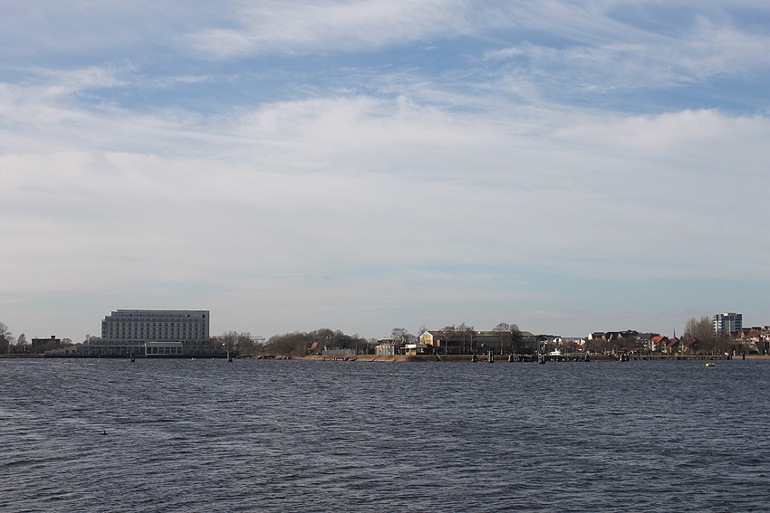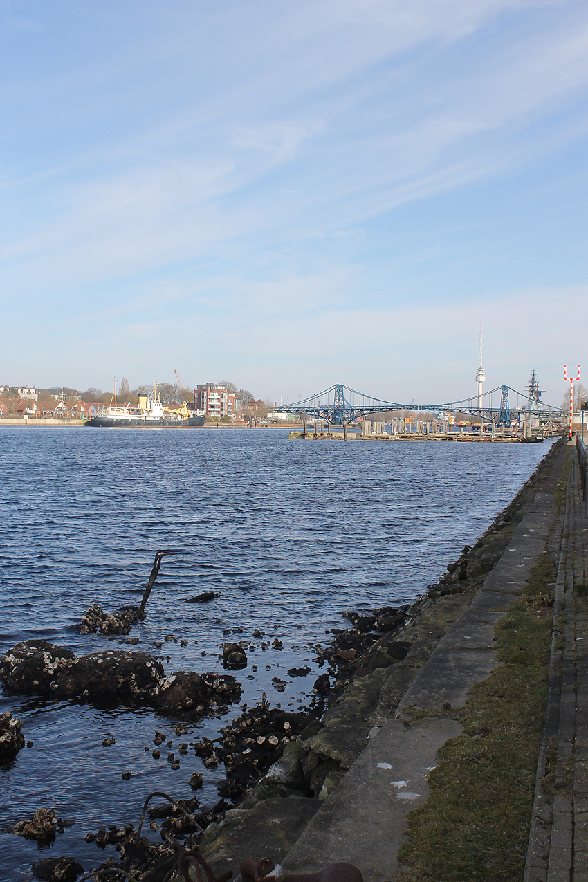 Seydlitzbrücke nördlich des Bunkers: Ursprünglich erstreckte sich die Seydlitzbrücke über den gesamten Südbereich des Hipperhafens in etwa vom West-Bereich des Südanlegers der Grodenfähre bis zum Ost-Bereich "Planschbecken". 1945 waren von den Konstruktionen der Brücke an der Kaimauer über dem Hafenwasser aber nur noch Bereiche mittig-östlich* und ganz westlich Richtung Grodenfähre vorhanden. Siehe dazu folgendes Bild mit "Monte Pascoal".