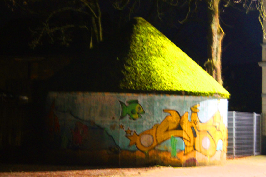 Der Bunker wurde bereits vor einiger Zeit neu angemalt. Die Metallblende vor dem Eingang wurde dabei übermalt.