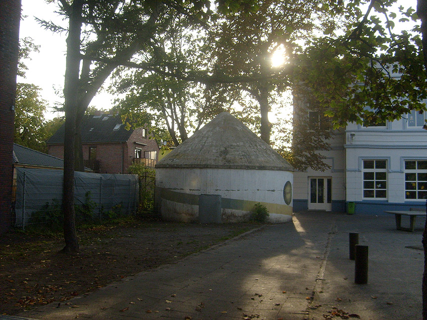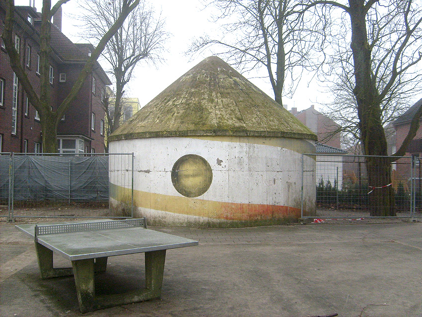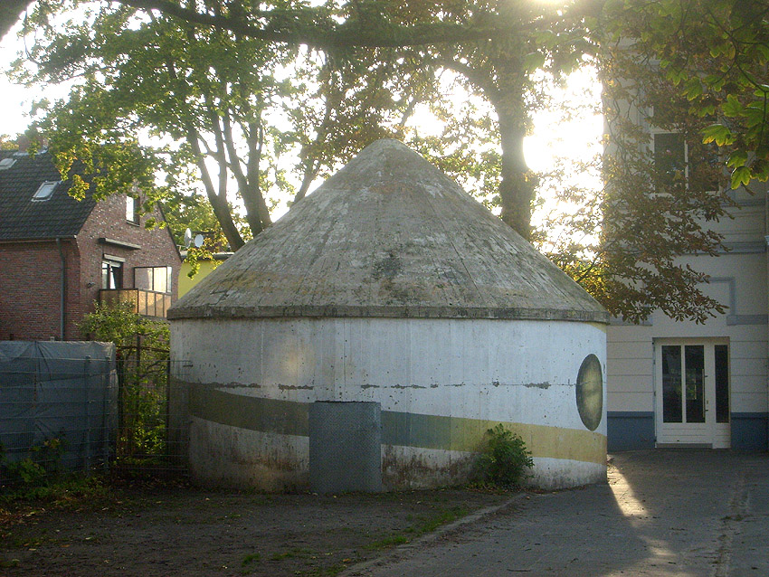 Wie auch beim baugleichen Rundbunker auf dem Schulhof der Franziskusschule ist zu sehen, dass der Haupteingang stets vom Gebäude weg zeigte. Im Falle einer Zertrümmerung des Gebäudes durch Bombentreffer sollte der Zugang keinesfalls verschüttet werden.