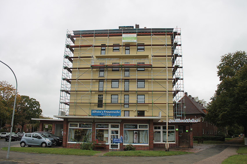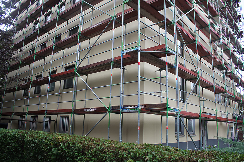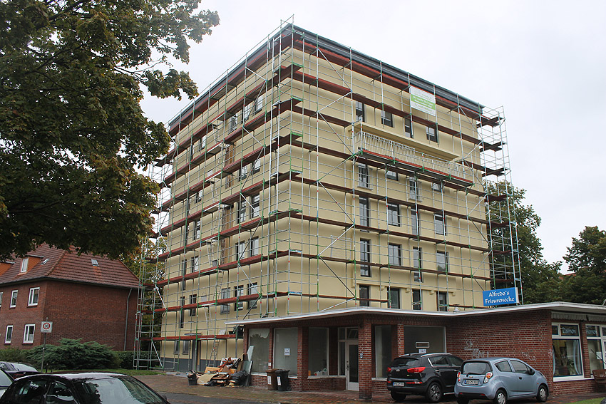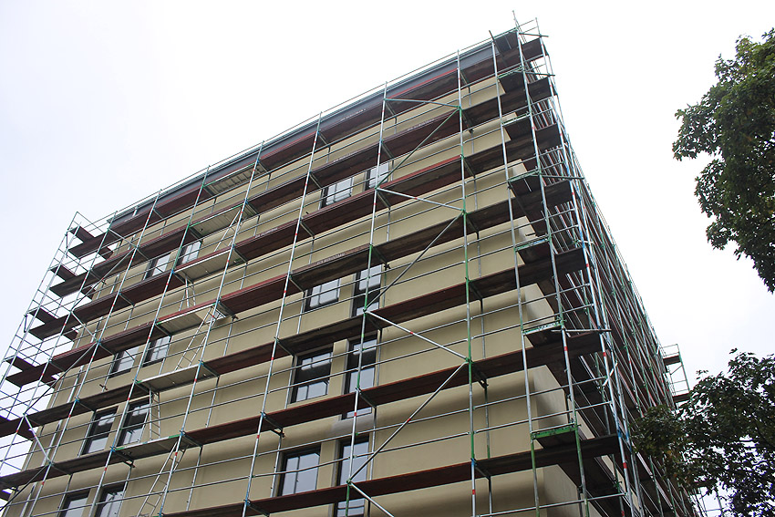 30. August 2019: Es tut sich nun wieder was. Der gesamte Bunker ist eingerüstet und Fassadenarbeiten schreiten voran.