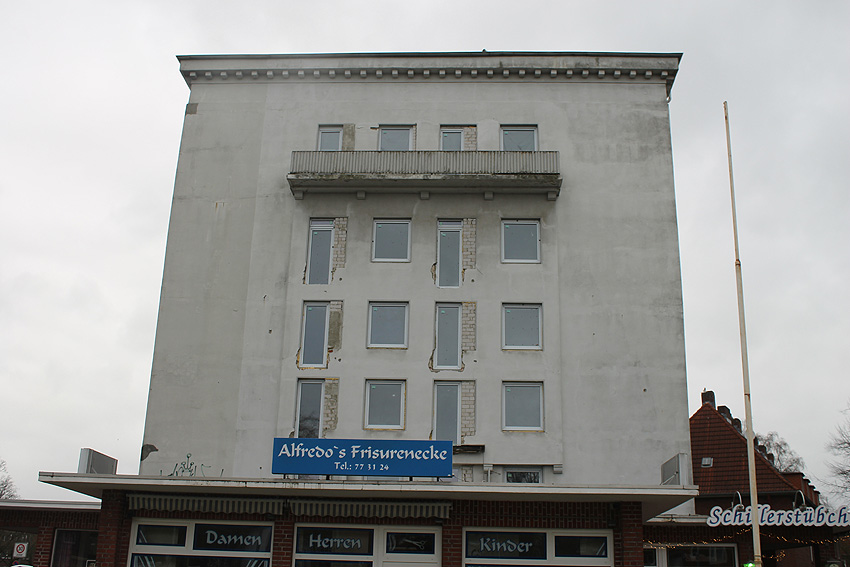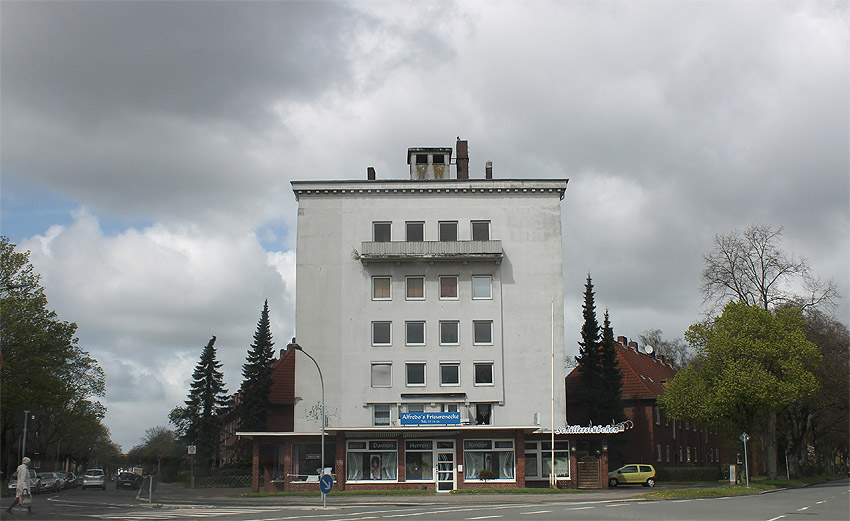 Dieser LS-Turm besaß genau entgegengesetzt der hier sichtbaren Seite einen am Dachbereich angesetzten Lüftungsturmanbau, ähnlich dem des Gorch-Fock-Luftschutzturmes, wie beschrieben baugleich zu dem des Bunkers Kantstraße und ähnlich denen der bekannten 10er (bzw.15er) Luftschutzturmreihe Wilhelmshavens. Interessant ist auch der noch heute vorhandene aufgesetzte Beobachtungsstand (mit relativ großen Sichtfenstern statt den üblichen Sichtscharten) und der verzierte Simsbereich, wie erwähnt baugleich zu dem des Bunkers Kantstraße. Nur fehlen hier im Gegensatz zur Kantstraße die eingelassenen Quadrate unter dem Sims.