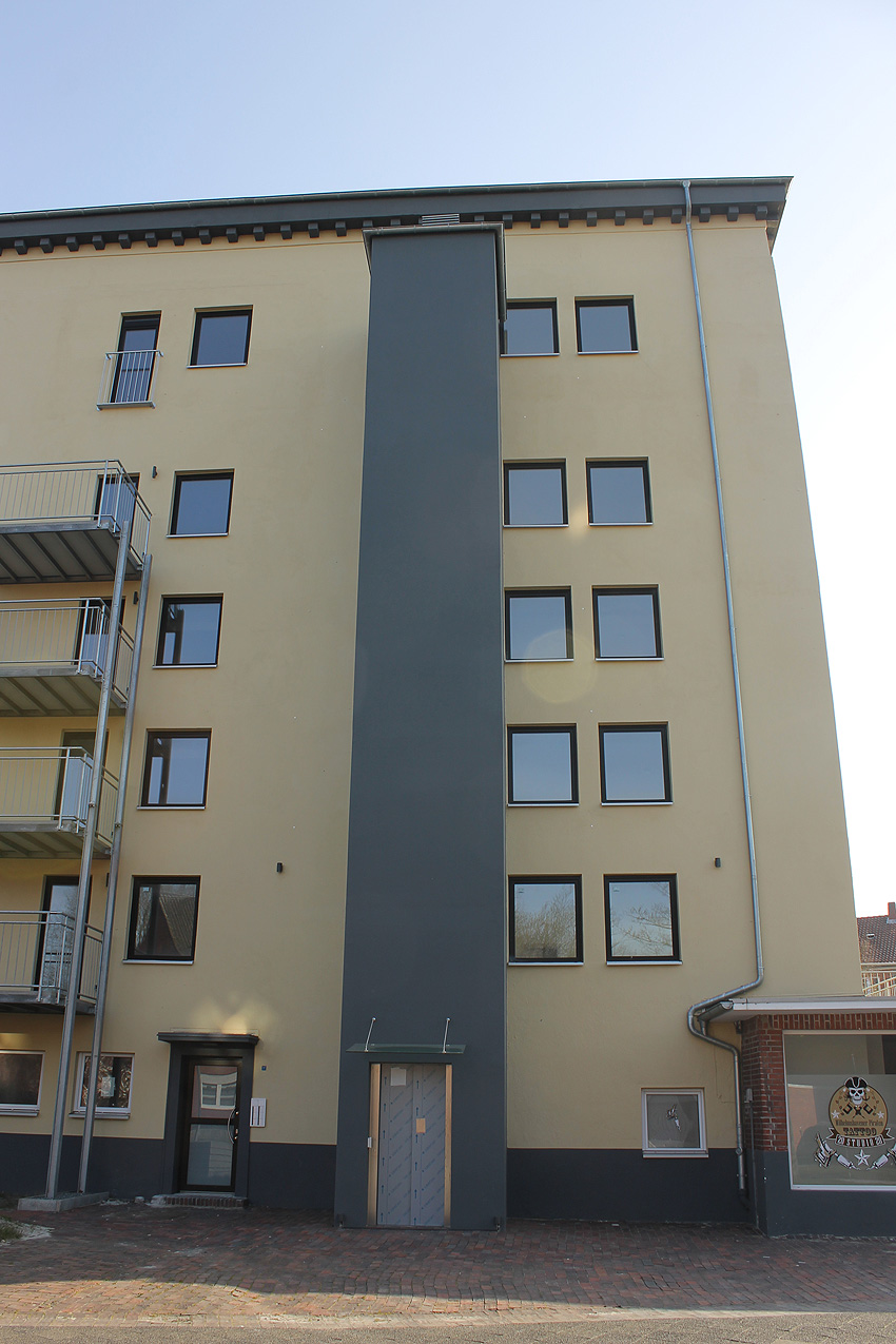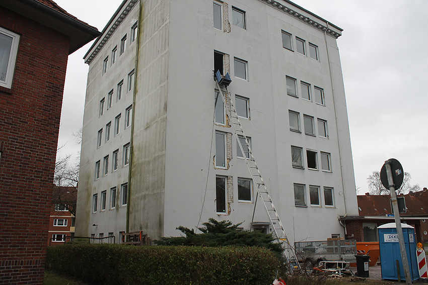 5. Oktober 2019: Die Fassade des Bunkers ist nun komplett neu gestrichen worden. Nachfolgend wird die Installation der Geländer vor die neu geschaffenen Türen erfolgen. An der Südwand beginnt die Maßnahme bereits. Balkone werden nicht angebracht.