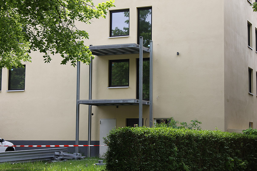 29. Mai 2021: Der heutige Stand. Nun werden doch "vollwertige" Balkone (wohl) an der West- und (auf jeden Fall) an der Ostseite des ehemaligen Luftschutzturmes installiert. Der Anbau an der Westwand dürfte einen Aufzugs- oder Treppenhausturm in Fertigung darstellen.