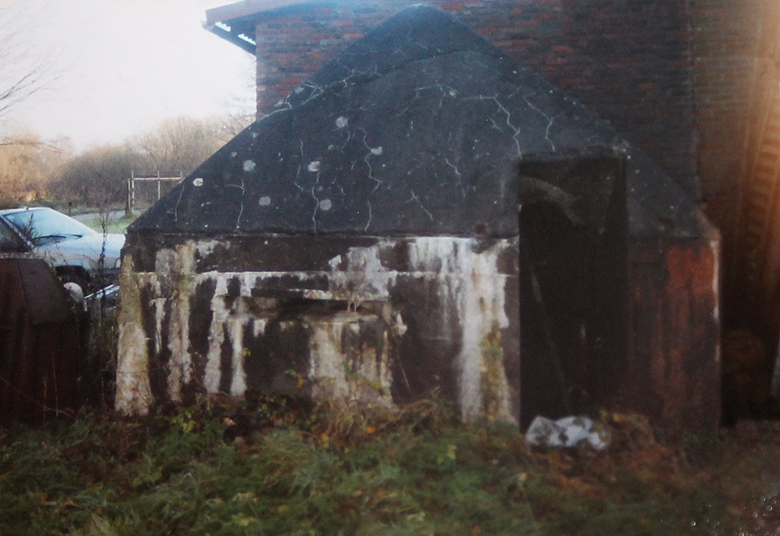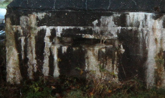 Dieser Umstand erklärt die vorhandene nun "blinde" und nachträglich vermauerte und verputzte Sichtscharte an der Ostseite des Bunkers. Unten vor den Rohren leicht zu sehen ist der Bereich der Scharte, welche nun gegen das nach dem Krieg neu errichtete Anbaugebäude "sehen" würde...