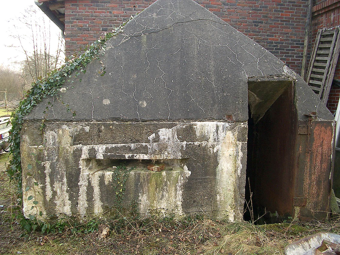 Aufgrund der drei nachgewiesenen Sichtscharten wird es sich um einen Beobachtungsbunker / Brandwache handeln. Auf Luftbildern ist zu erkennen, dass das hier auf dem Bild ersichtliche Anbaugebäude vom Hauptgebäude direkt hinter dem Kleinbunker im Krieg noch nicht vorhanden war...