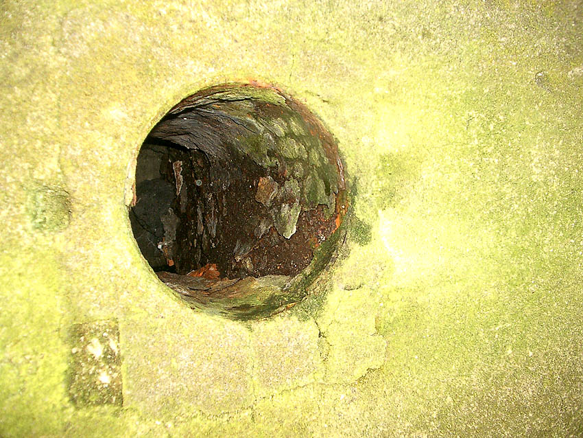 Neben dem Eingang befindet sich an der Südseite ein gemauertes Podest. Der "Innenraum" ist hohl, wahrscheinlich war er ursprünglich mit Sand aufgefüllt...
