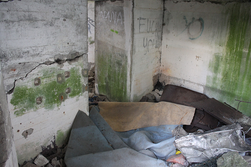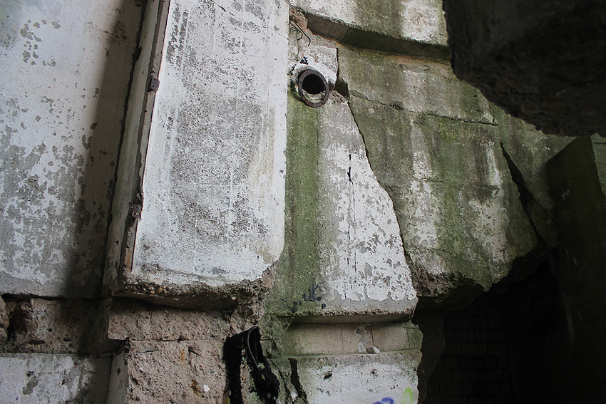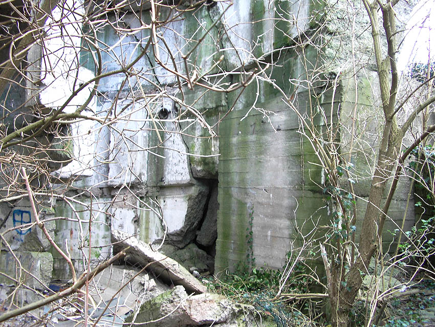"Detonation einer Bombe nach Abgleiten vom Spitzdach direkt vor dem Bunkereingang (gemeint ist der zweite Eingang, beziehungsweise Notausgang - leicht erhöht - rechts des Haupteinganges) während eines Luftangriffes 1943 / 1944. Dadurch wurde die komplette Eingangstreppe weggesprengt (auch vor diesem Notausgang befand sich eine Treppe, siehe Bild oben) und die Schutzsuchenden im Bunker mussten nach der Entwarnung von Marineangehörigen der benachbarten Werft mit Leitern herausgeholt werden*. Danach wurde provisorisch eine Holzleiterkonstruktion angebracht."
