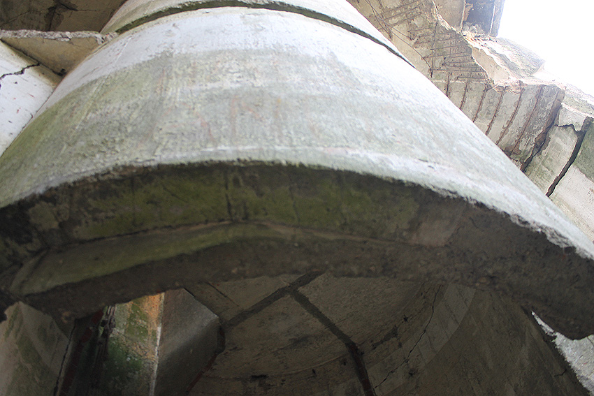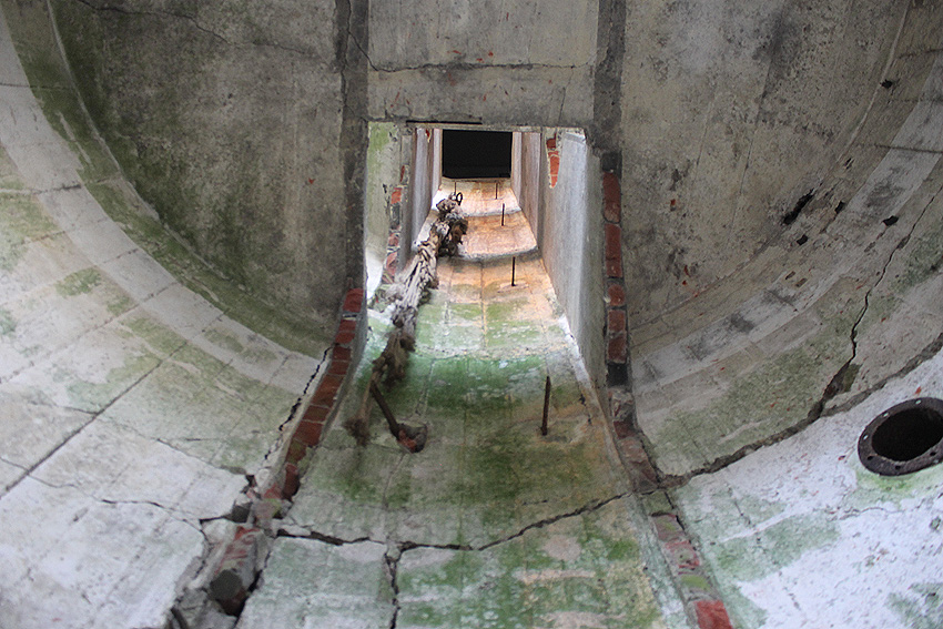 Interessant ist dieser Schacht. Er führt in der Abortsäule bis nach oben an / in die Turmkuppel hinein, die an der Stelle scheinbar einen Hohlraum (!) aufweist.