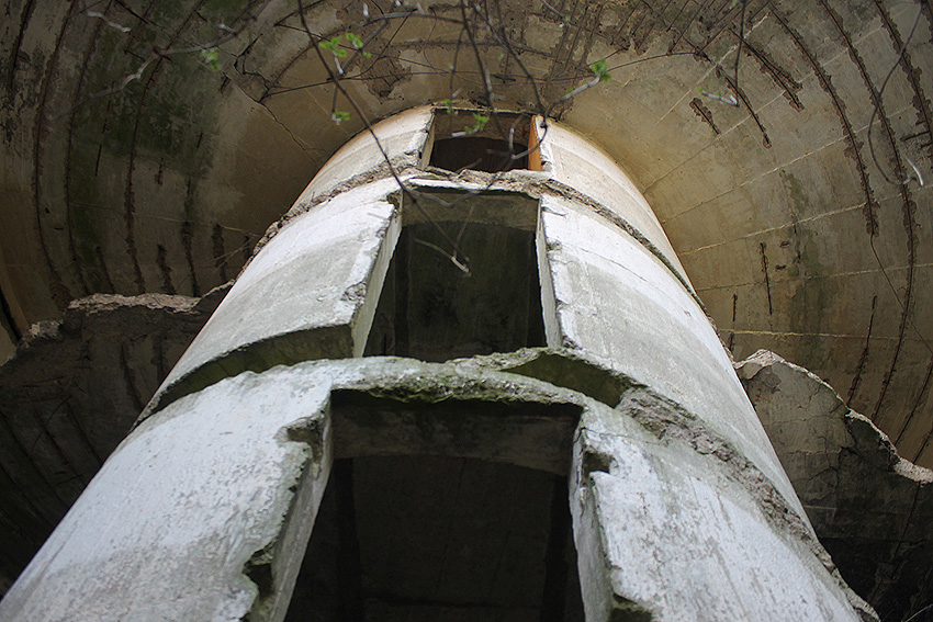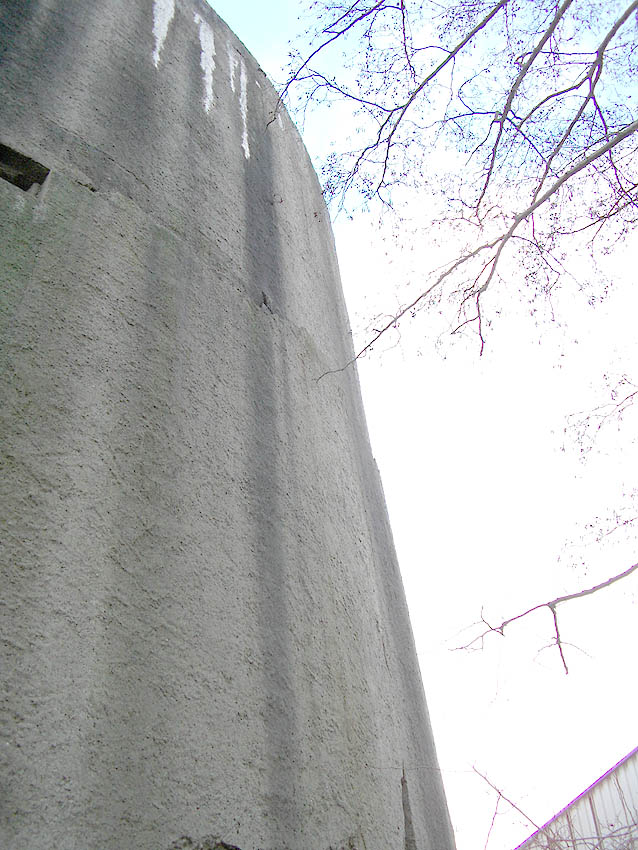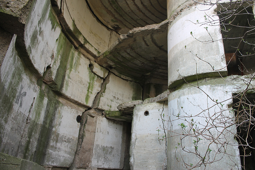 Nach der Sprengung. Der LS-Turm kippte nicht nach Norden zwischen die Kasernenbauten, wie von den Besatzern gewollt. Er blieb in diesem Zustand stehen, war aber augenscheinlich demilitarisiert und wurde der Stadt überlassen. Später wurden zwei Betonblöcke an die Bruchstellen des Sockelbereiches gegossen, um den Turm zu stabilisieren.