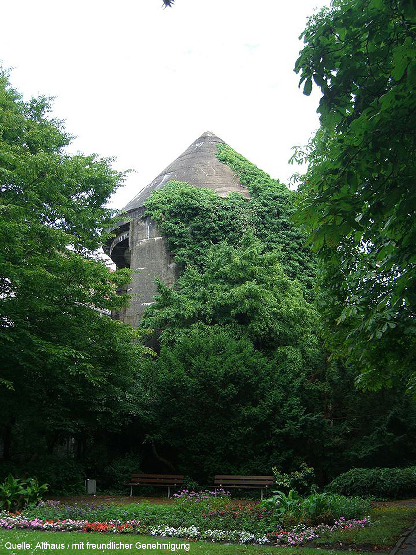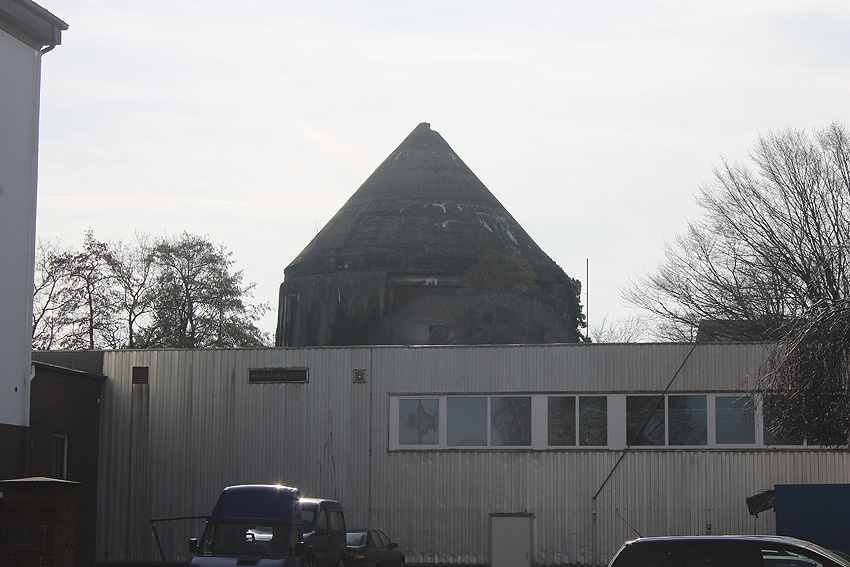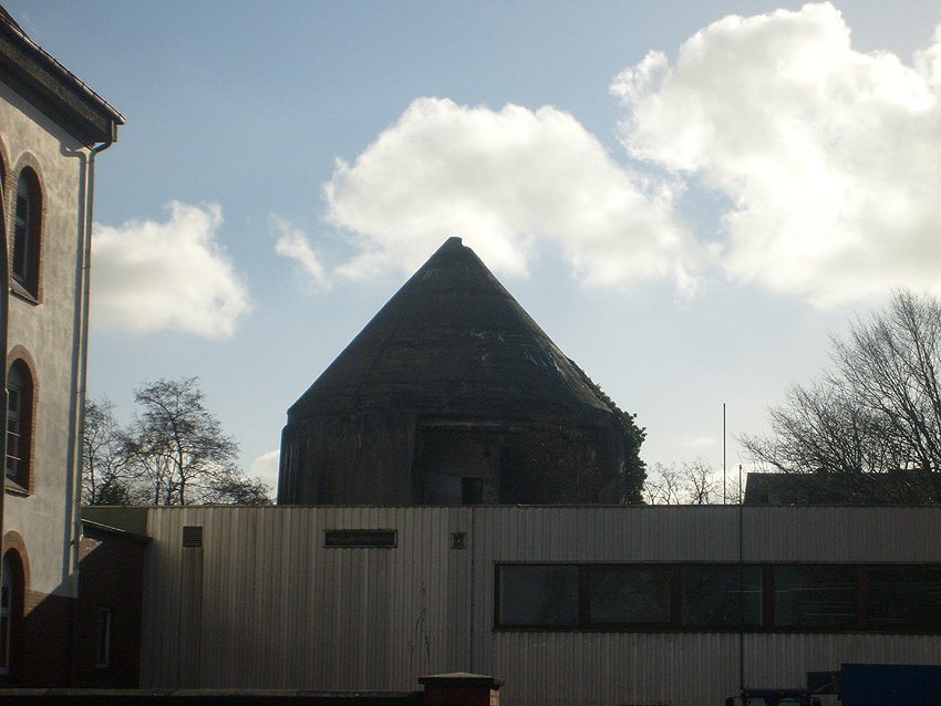 Hier sind noch Reste des schwarzen Tarnanstrichs der Dachkuppel zu sehen. Rechts neben dem Luftschutzturm ist der T 1500-Hochbunker "Trotz" teilweise zu erkennen.