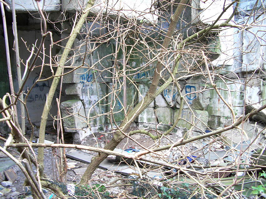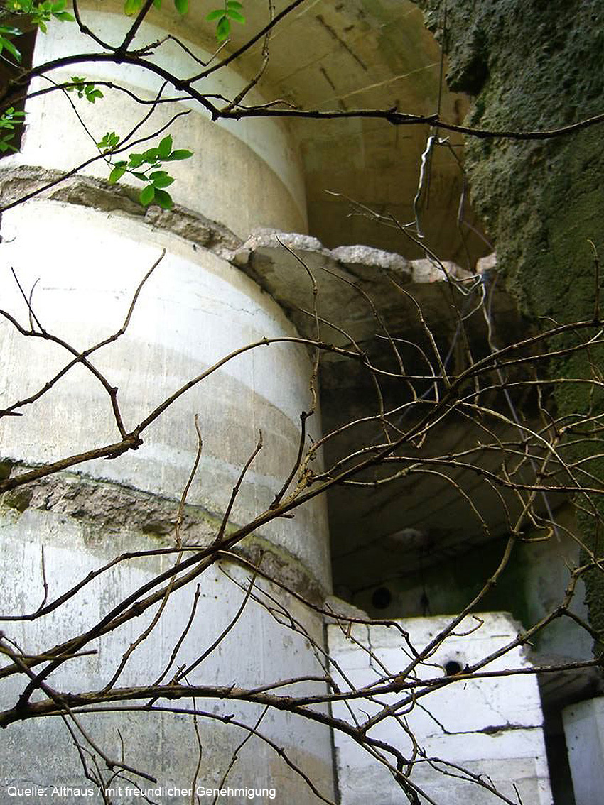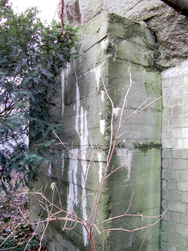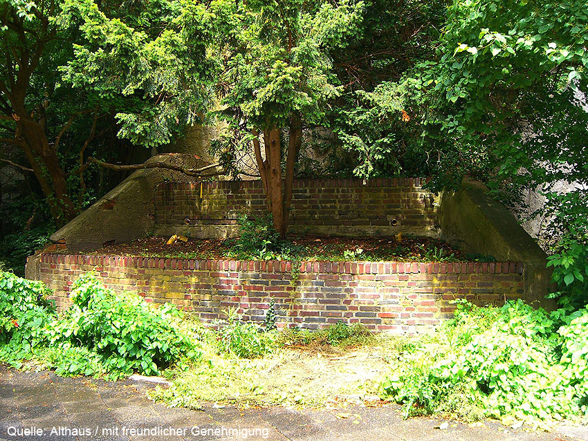 Betrachtet man das oben bereits abgebildete Foto aus den 1950er Jahren, so ist erkennbar, dass zumindest Teilbereiche der erhöhten Eingangstreppe / Rampe den Bombeneinschlag überstanden haben (links neben dem erhöhten Eingang). Die Plattform unter dem Eingang selbst wird vermutlich die nachträgliche Holzkonstruktion dargestellt haben, obwohl sie der Originalplatte aus Beton sehr ähnelt: