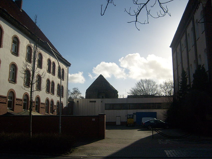 Vorne der Zombeckturm an der heutigen Rheinstraße, hinten der LS-Turm an der Ecke Rheinstraße / Gökerstraße mit schwarzer Tarnbemalung der Kuppel... Am Zombeckturm ist noch kein schwarzer Tarnanstrich der Dachkuppel vorhanden, er ist erst zur Kriegsmitte dort angebracht worden. Deshalb wird das Bild höchstwahrscheinlich bereits in frühen Kriegstagen aufgenommen worden sein.