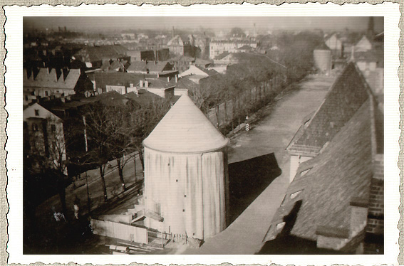 Dieses Bild wurde aus dem Dachbereich der anliegenden Bismarckkaserne / Moltkekaserne von Marineangehörigen aufgenommen. Es zeigt den intakten Luftschutzturm. Es ist das einzige bisher bekannte Bild, das auch einen kleinen Bereich der Seite des Turmes zeigt (ganz rechts), die später bei der Sprengung herausgebrochen ist.