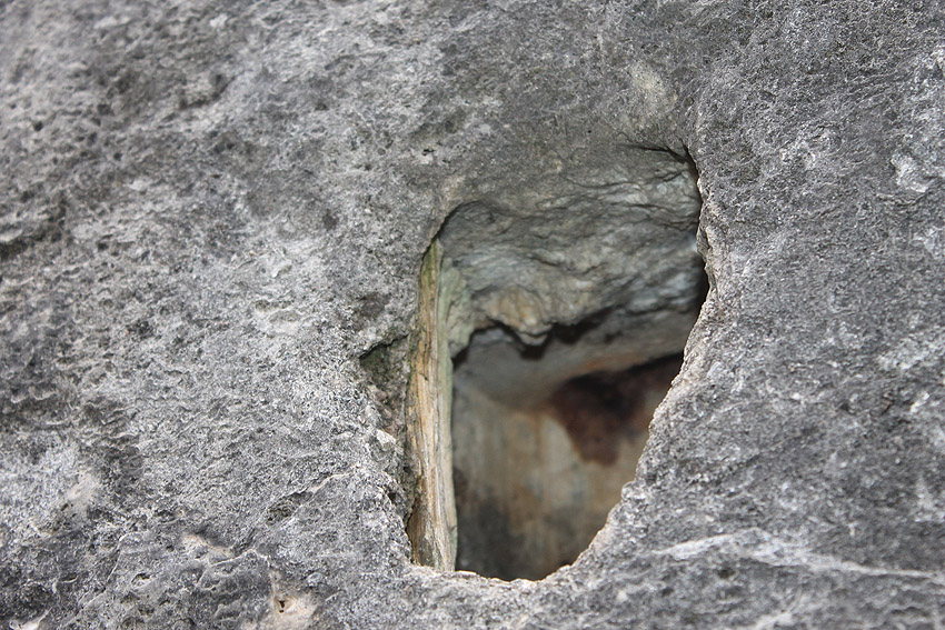 Hier war ein mutmaßlich verbunkerter Anbau in Röhrenbauform angesetzt. Links zu sehen ein runde Aussparung am Bunker in vertikaler Richtung. Dort könnte ursprünglich eine Art Rohr positioniert gewesen sein...