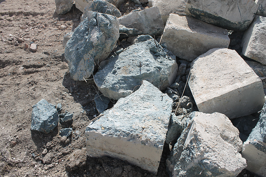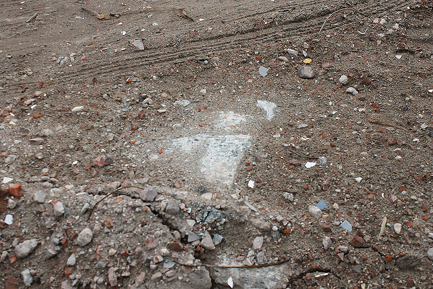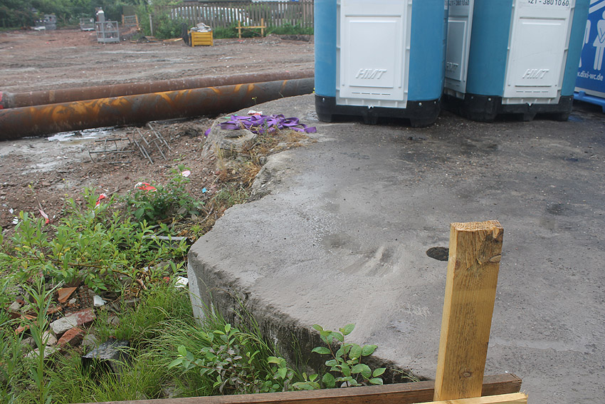 Stand 05.09.17 (!): Die Fundamentplattenbeseitigung war zunächst bis Mitte 2017 vorgesehen gewesen, das Beseitigungszeitfenster ist nun wieder unklar. Im mittlerweile immer mehr zuwuchernden Gelände ist die Platte noch immer vorhanden. Wir berichten weiter.