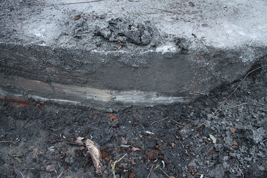 Wir haben nachgeschaut: Wohl keine Bewehrungsverbindungen zum ehemaligen Bunkerkörper auf der Platte. Eventuell wurde die Platte nach dem Abriss des Bunkers geglättet. Die Tatsache, dass wohl keine Bewehrungsverbindung zwischen Wand und Boden vorhanden war, dürfte den säuberlichen Abriss des Bauwerkes hervorgerufen haben, ohne dass die Platte (die eventuell nach Beseitigung des Bunkers von der Schule zunächst als eine Art Pavillon-Grundboden oder als Standplatz für ein Spielgerät genutzt wurde) beschädigt wurde. Auch an der noch vorhandenen Platte des Rundbunkers Sachsenstraße ist gut zu sehen, dass dort nur spärlich Bewehrung vom Fundament in die damaligen Wände führte: