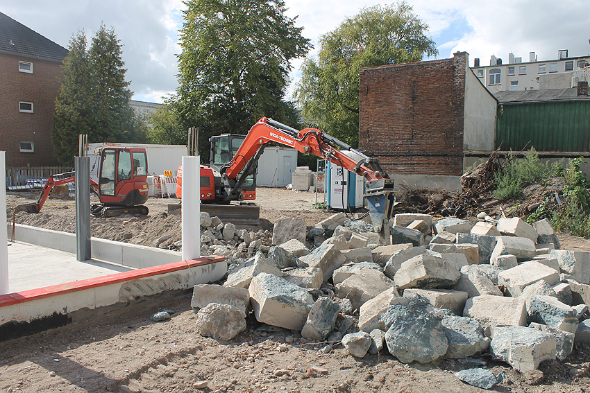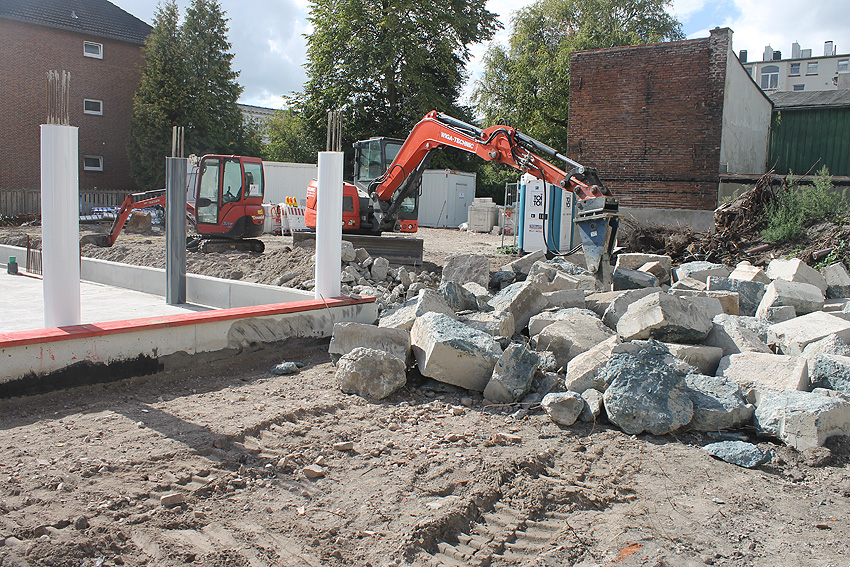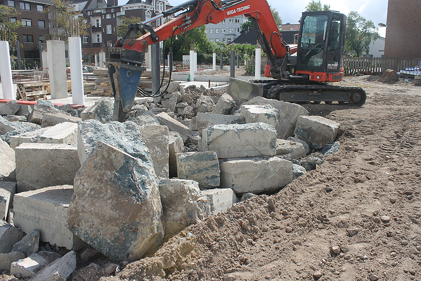 Stand 29.07.18: Wider Erwarten dürfte die Bunkerplatte glücklicherweise doch erhalten bleiben. Sie wurde lediglich im Südostbereich zusätzlich zu den damaligen Abbruchbereichen noch ein kleines Stück abgefräst. Der Neubau wird dort dann direkt an die Platte grenzen. Wir berichten weiter.