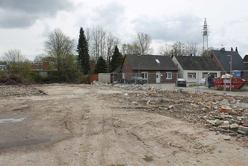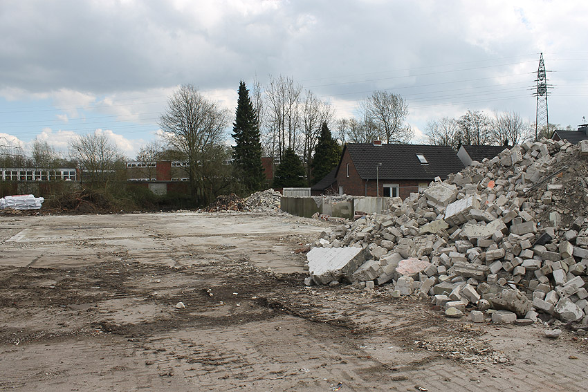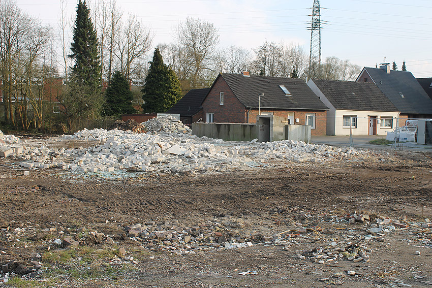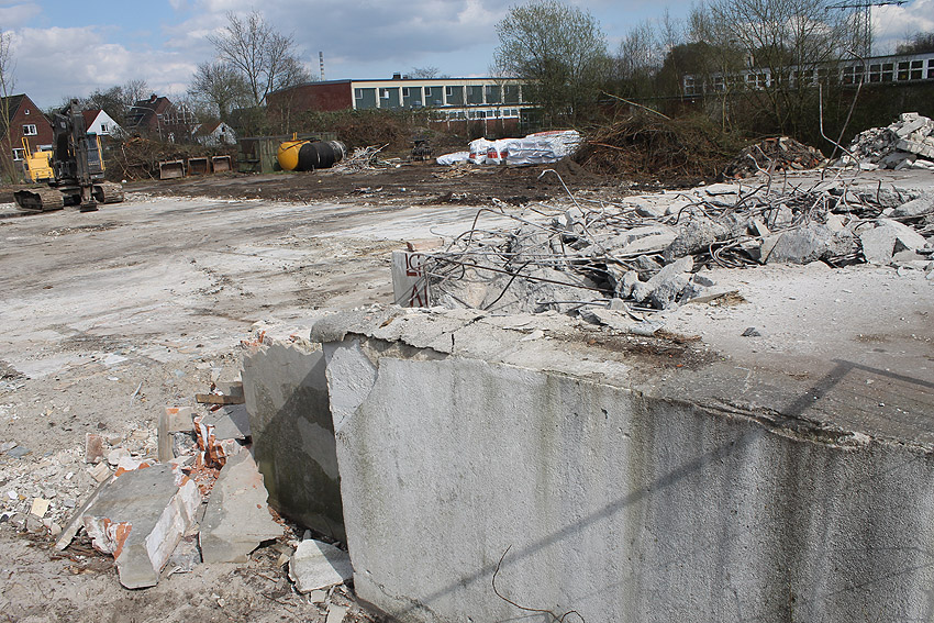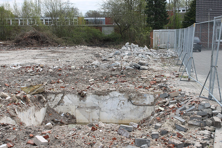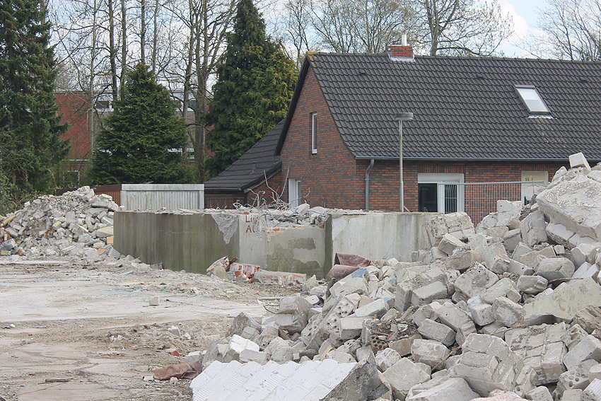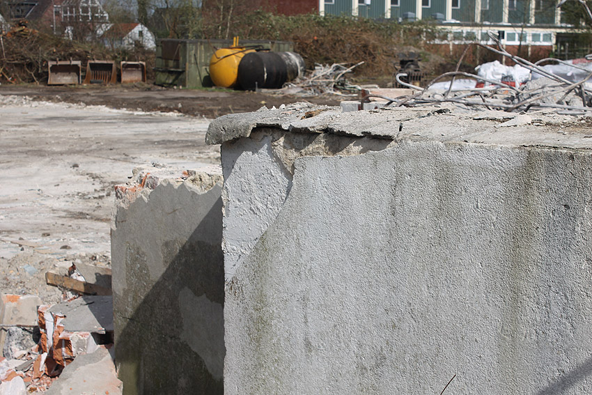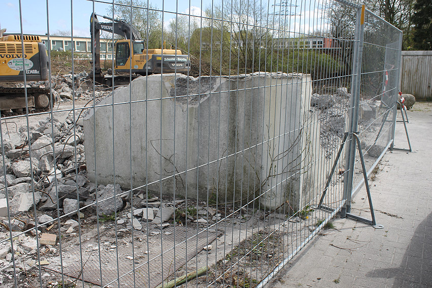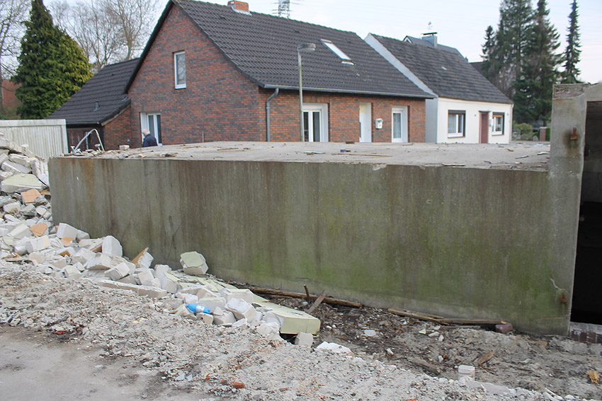 Der kleine Schutzbau Rüstersieler Straße 67 befindet sich seit gestern, 15. April 2016, im Abriss. Der Eingangsbau ist bereits zerstört, ebenso ein Teilbereich der Decke. Damit verschwindet wieder ein Relikt, das man ohne Mühe hätte als Anschauungsobjekt erhalten können. Gestört hätte allein platzmäßig das kleine Bauwerk für das Neubauvorhaben bestimmt nicht...