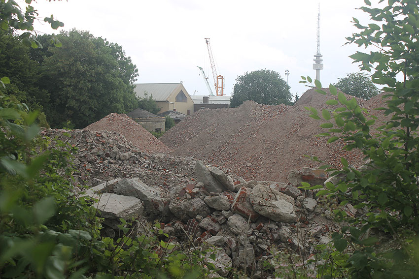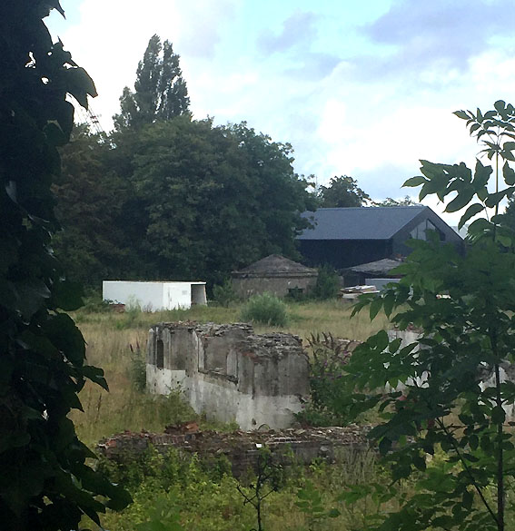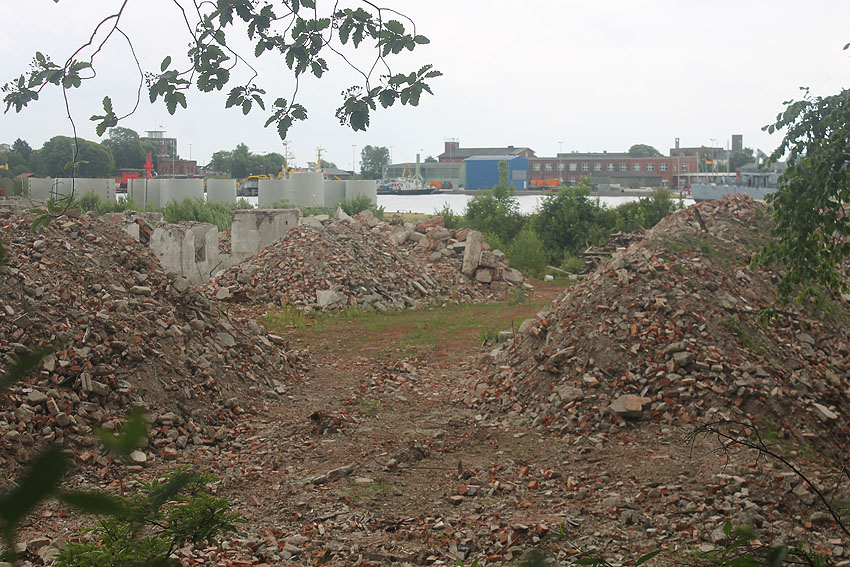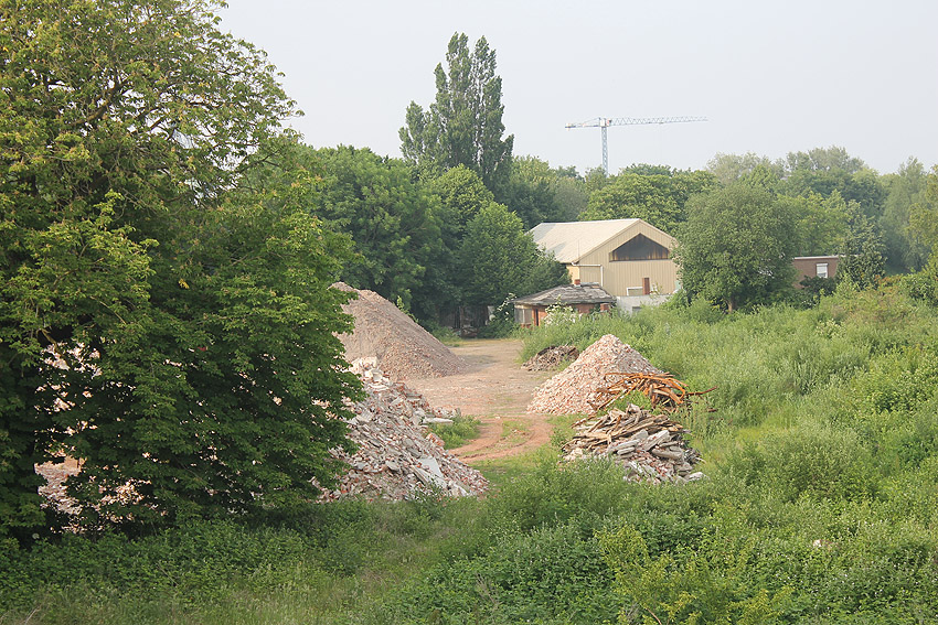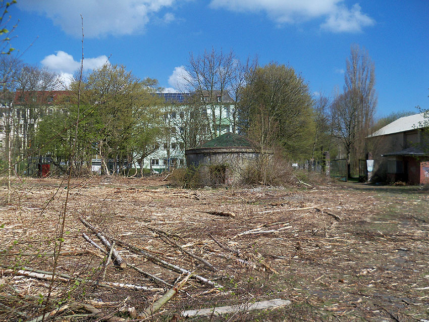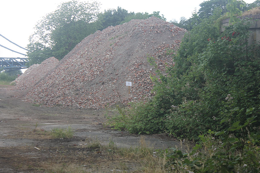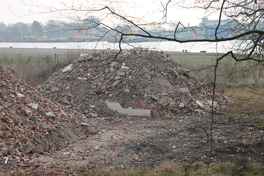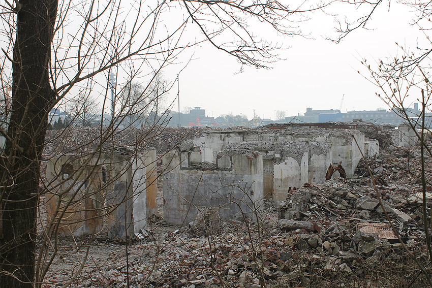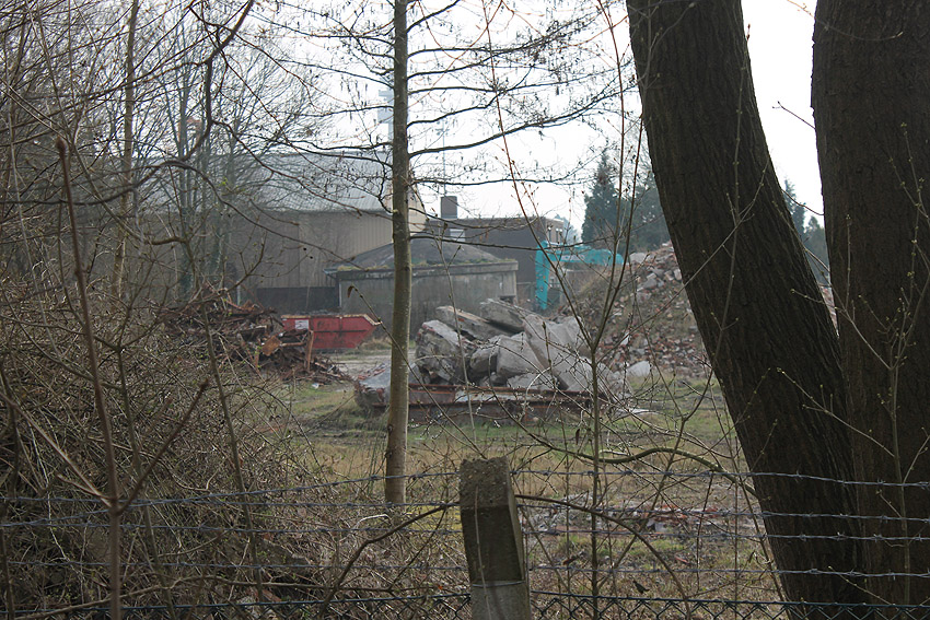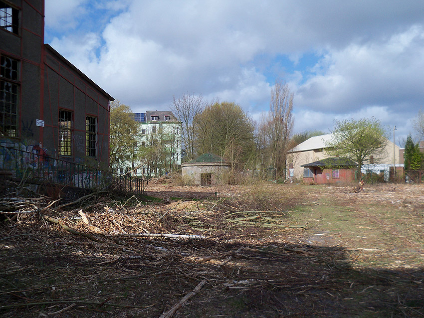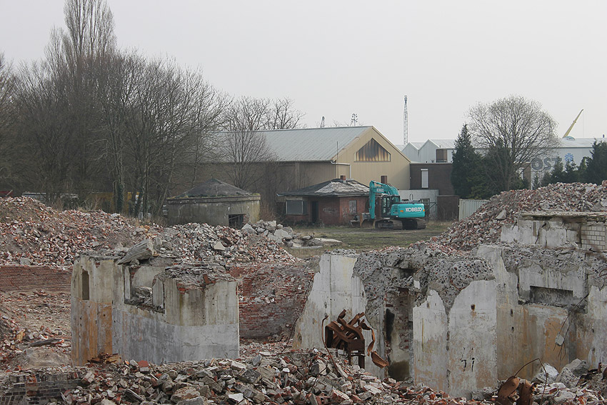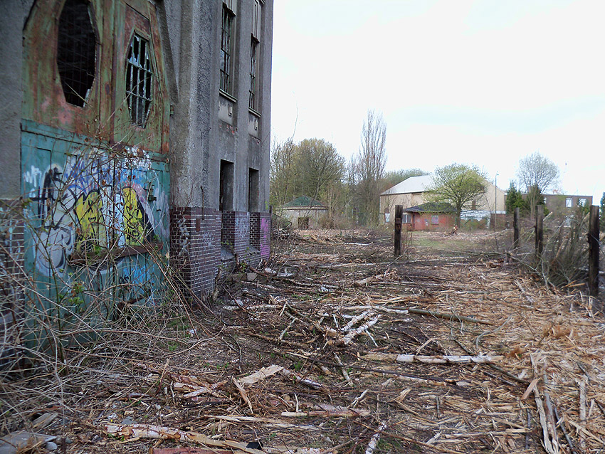 10.04.18: Die Schuttbeseitigungsmaßnahmen waren bereits seit Wochen großteilig wieder ausgesetzt. Kurz vor deren kompletter Aussetzung wurde noch das letzte erhaltene Teilstück des ehemaligen Wohntraktes- Wirtschaftstraktes der Südzentrale in Richtung K.W.-Brücke planiert. Wir berichten hier weiter.