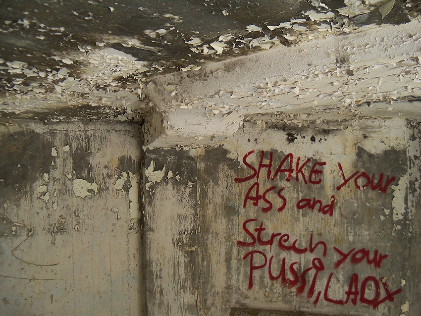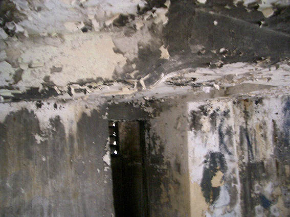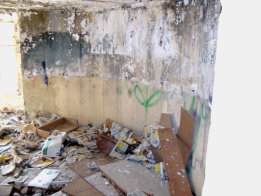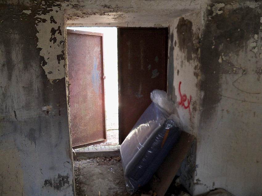 Blick zum Eingang. Der Bunker verfügt über erstaunlich dicke Wände. Dies könnte sein, da der Bunker eventuell teilweise lediglich nur gemauert (und verputzt) zu sein scheint...