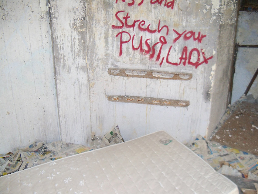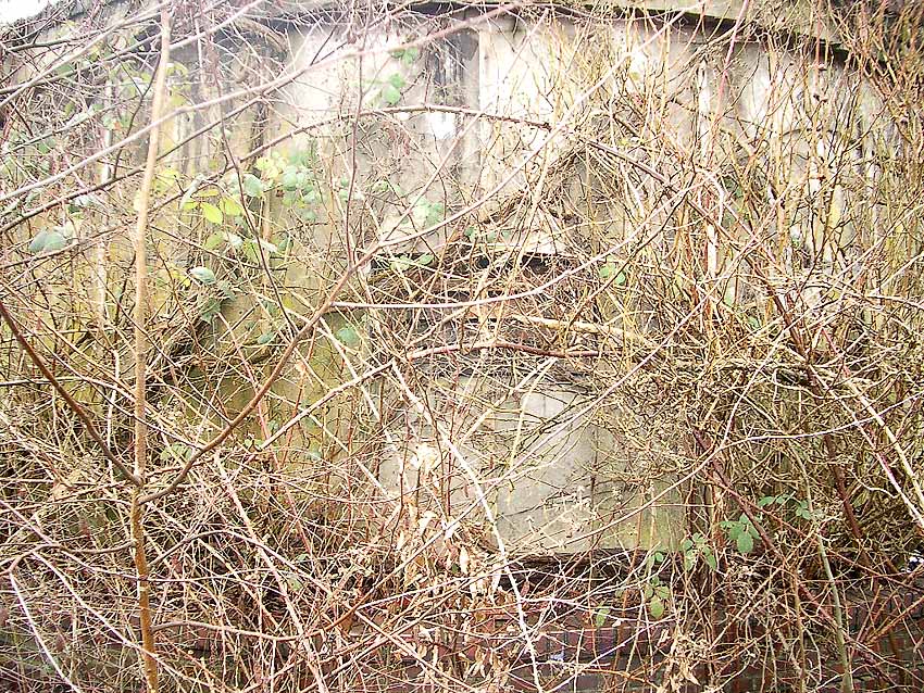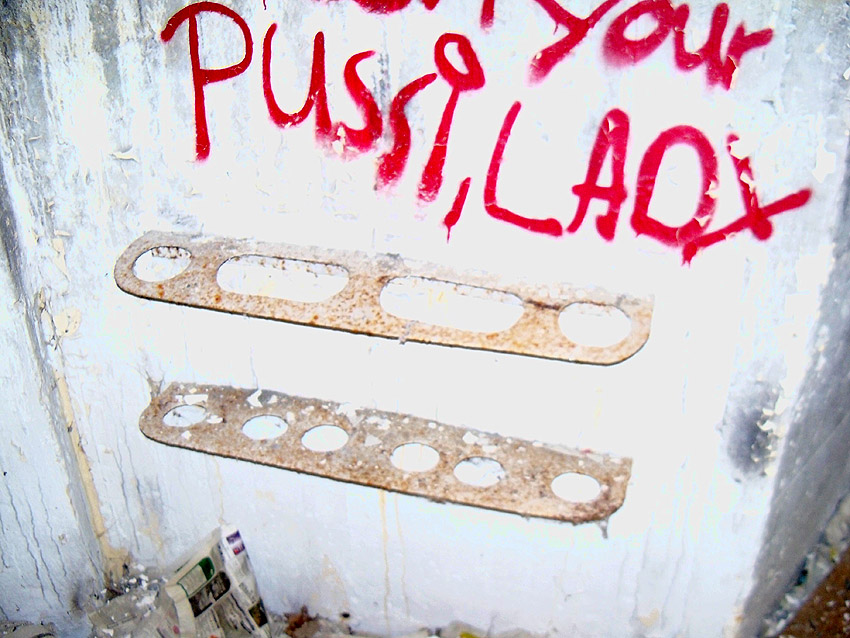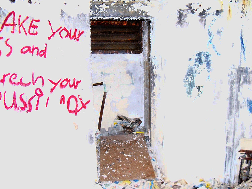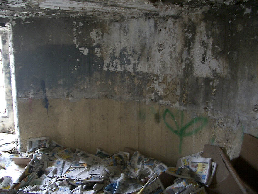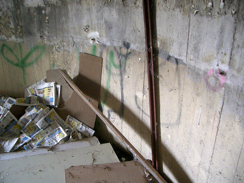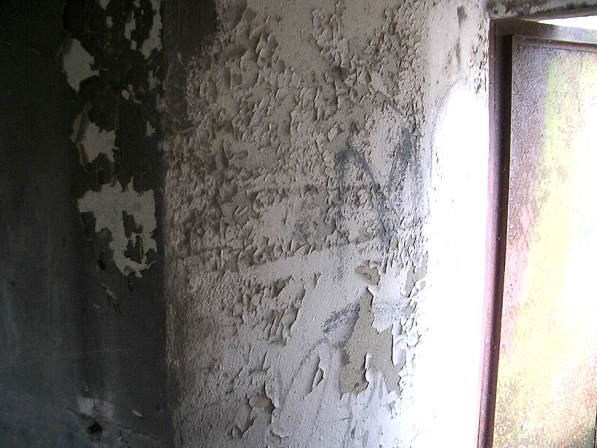 Der Eingang. Auch hier ist Mauerwerk erkennbar. Wurde die Tür nachträglich verbreitert? Oder befindet sich eventuell sogar eine Klinkerschicht ringsum an der Außenwand, die dann mit Putz verblendet wurde? Eine Fertigung der Außenwand aus Beton und Mauerwerk kann stark angenommen werden.