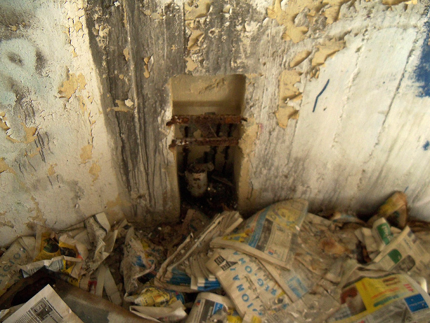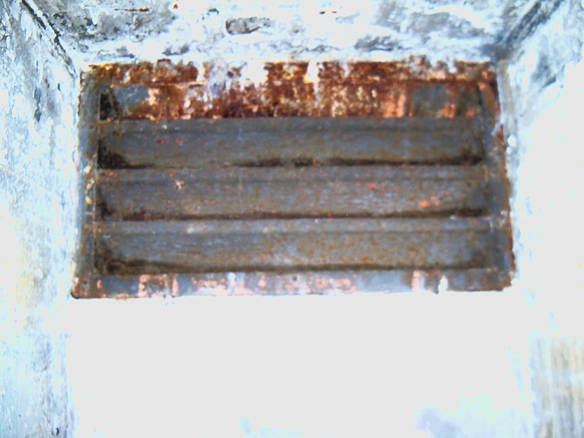In den Notausgangsbereich wurde nachträglich diese Lüftung eingebaut. In diesem kleinen Raum in der Wand befindet sich ein Rahmen, welcher noch original sein könnte. Sinn und Zweck sind uns unbekannt. Er wird jedoch etwas mit einer eventuellen Notausgangsluke zu tun gehabt haben...