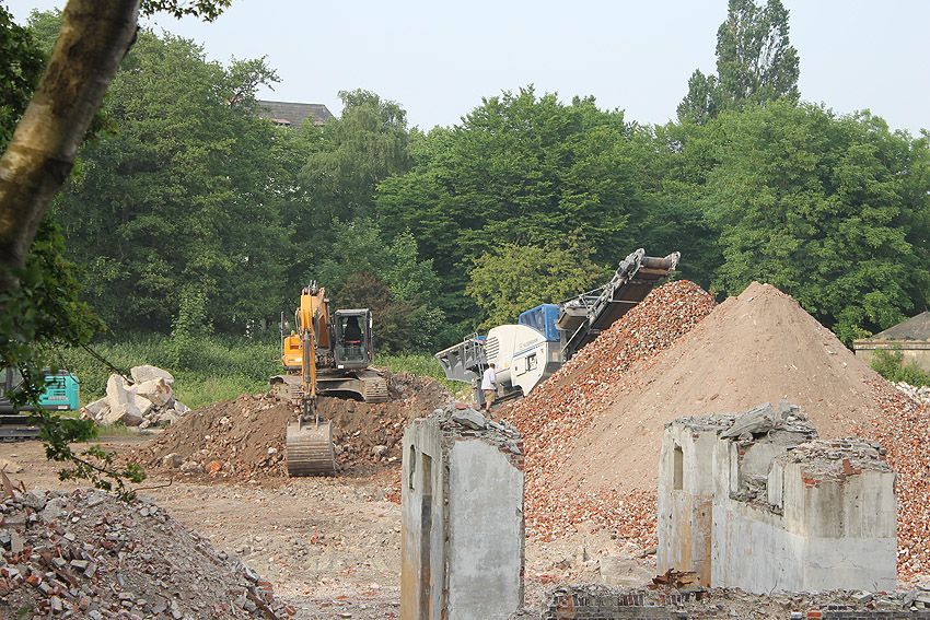 28.05.18: Die Schuttbeseitigungsmaßnahmen sind wieder aufgenommen worden... Nun steht sogar eine Brechmaschine zur Trümmerzerkleinerung auf dem Gelände. Wir berichten hier weiter.