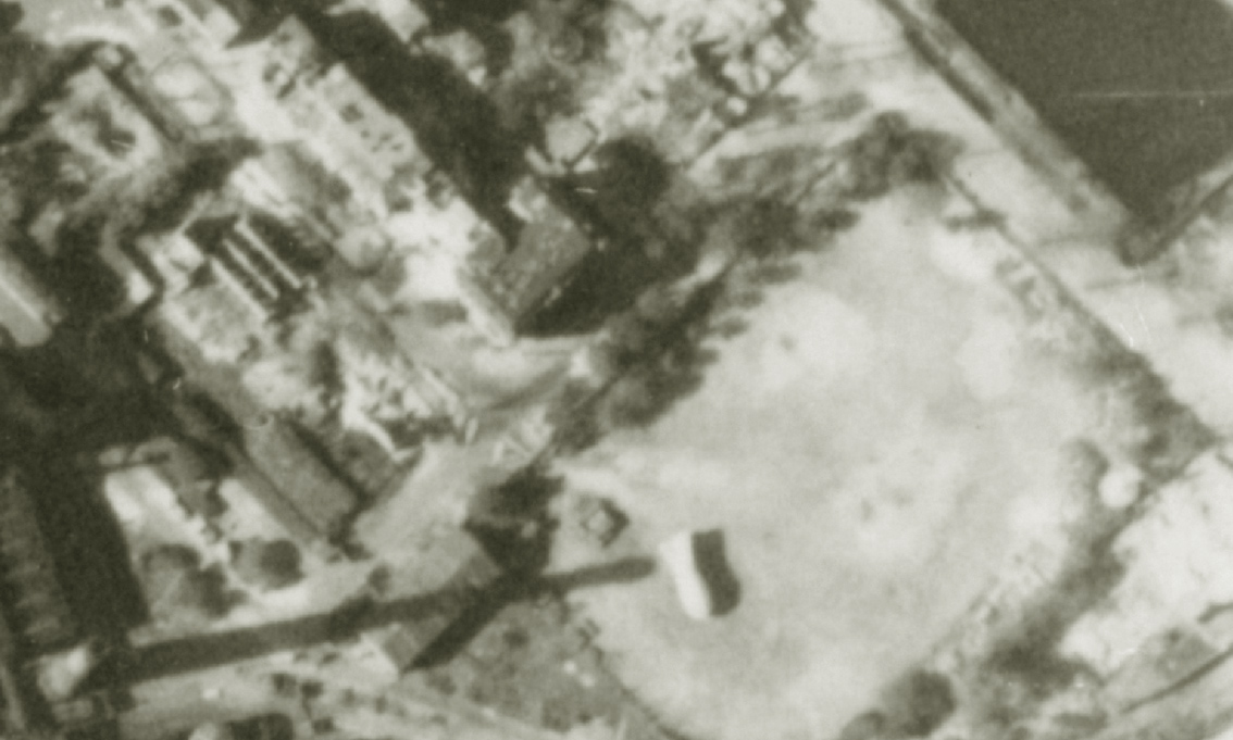 Mitte / unten links zu sehen Rundbunker Südzentrale, Mitte / unten rechts Rundbunker Manteuffelplatz, auf dem Platz ein Sperrballon, oben mittig Rundbunkerverdacht im Hinterhof Manteuffelstraße / Rheinstraße.