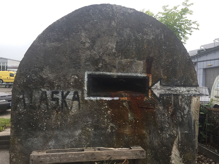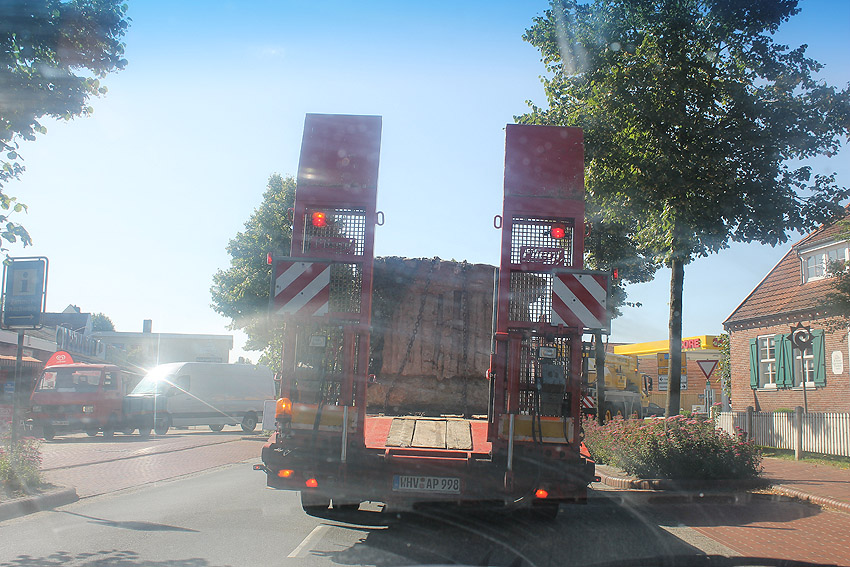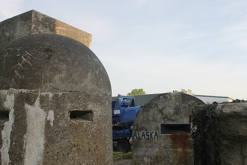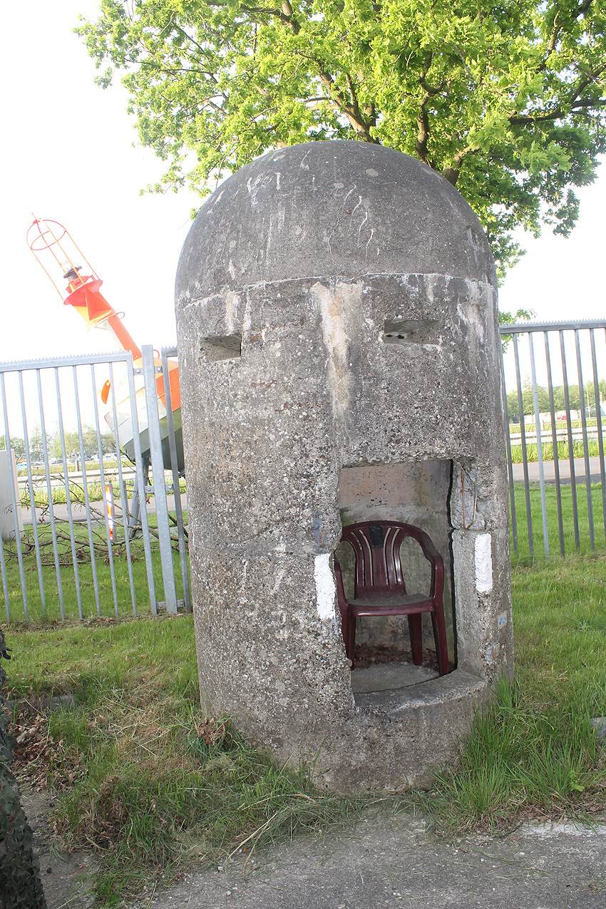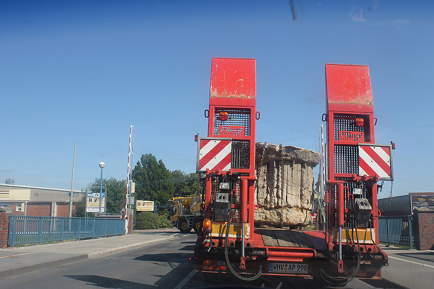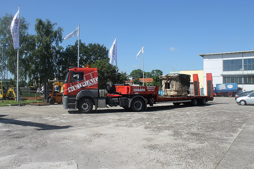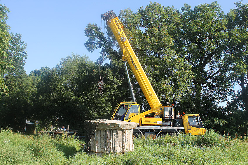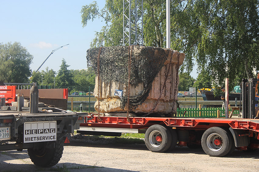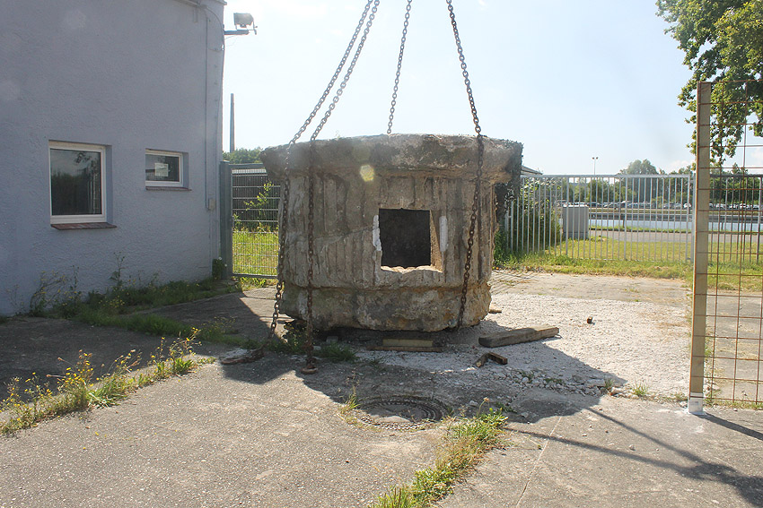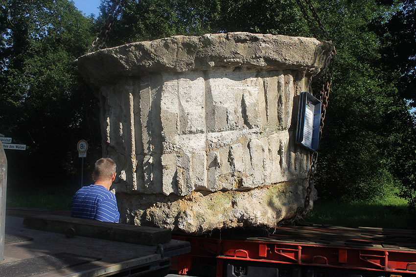 18. Juli 2013: Nach einem halben Jahr Vorbereitung und Koordinierung sagen wir heute: "Ende gut, alles gut!" Der Tobrukstand als interessantes, martialisches Zeugnis des geplanten "Friesenwalls", in einem Friedeburger Erdloch für einen MG-Schützen Ende 1944 gegossen, wurde heute intakt nach Wilhelmshaven verbracht. Er steht nun als erster von fünf Kleinbunkern auf dem IEHF-Gelände am Kanalweg. Wir danken der Firma Hepag für den reibungslosen Transport, der Interessengemeinschaft zur Erhaltung historischer Fahrzeuge für den Stellplatz, der Firma JK-Fahrzeugtechnik für die Holzspende, dem WZ-Fotografen für die Ausdauer (wir hatten uns um ca. 30 min. mit der Ankunft verschätzt) und Herrn Wiard Remmers, der alles damals und bis jetzt durch seine Hilfe erst ins Rollen brachte.