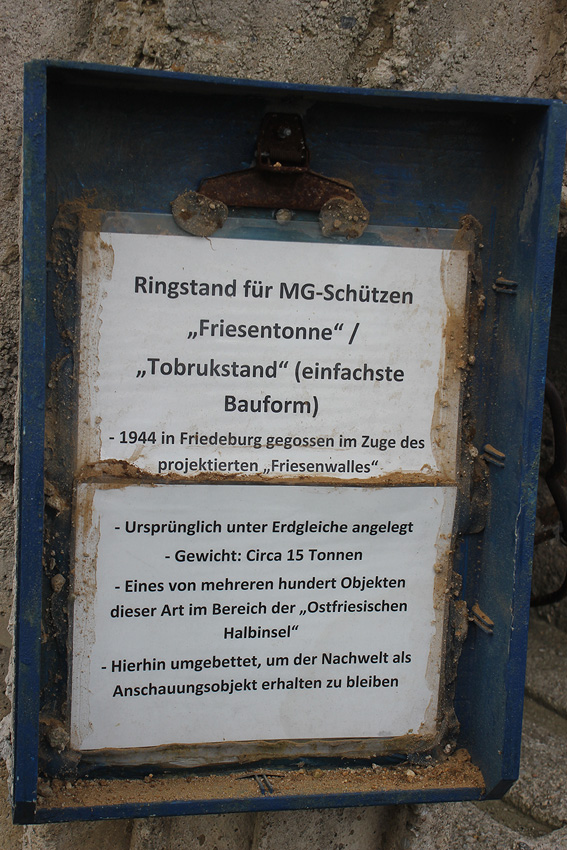 Kurzinfo: Es handelt sich hierbei um eine "Friesentonne". Der Begiff wurde im Bereich der Deutschen Bucht nachweisbar für Ringstände einfachster Bauart benutzt und ist auch in Schriftdokumenten wiedergegeben. Als "Friesentonnen" wurden sowohl einteilige "Tobrukstände" (benannt nach der Festung Tobruk Nordafrika / Afrikakorps Rommel) einfachster Form bezeichnet, wie auch die aus mehreren Teilen bestehenden "Kochbunker / Koch-Bunker / Kochstände / Koch-Stände" (nach Gauleiter Koch Ostpreußen).