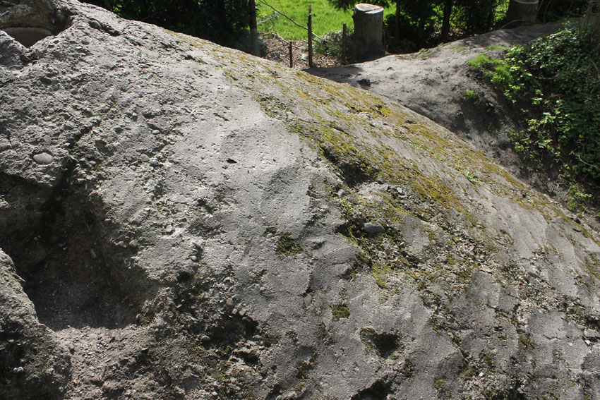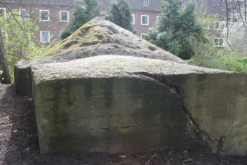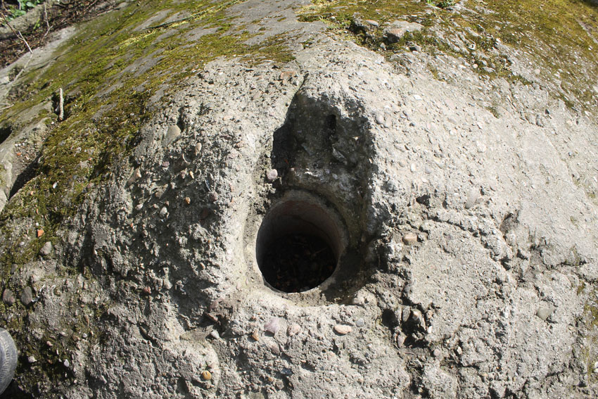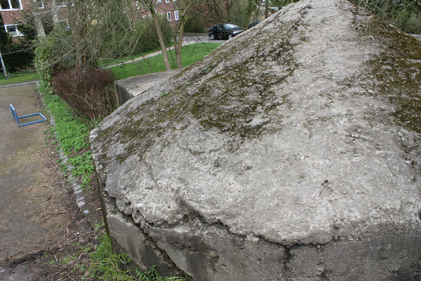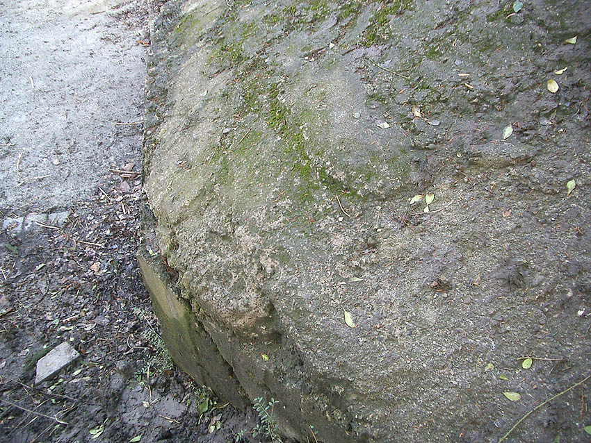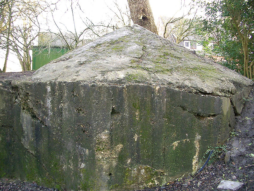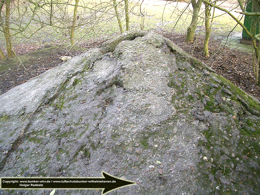 Der Beton der Kuppel wurde mit einem Spaten festgeklopft. Der Bunker ist in Eigenbau entstanden. Die Betongüte und die Schalung sind als eher dürftig zu bezeichnen. Es kam bei diesem Bauwerk nur noch auf die schnelle Schaffung eines Schutzraumes an.
