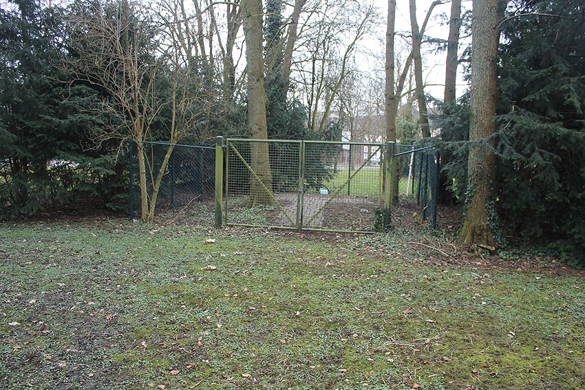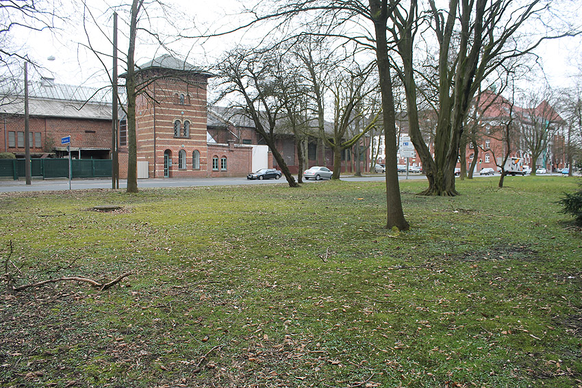 Der Standort heute. Links zu sehen das abgezäunte Gelände des späteren Nachkriegs-Tiefbrunnens Nr. 3... Der Brunnenschacht / Anschluss wird im Krieg zum Inneren des Turmes in dessen Westwand hinein fortgeführt haben.