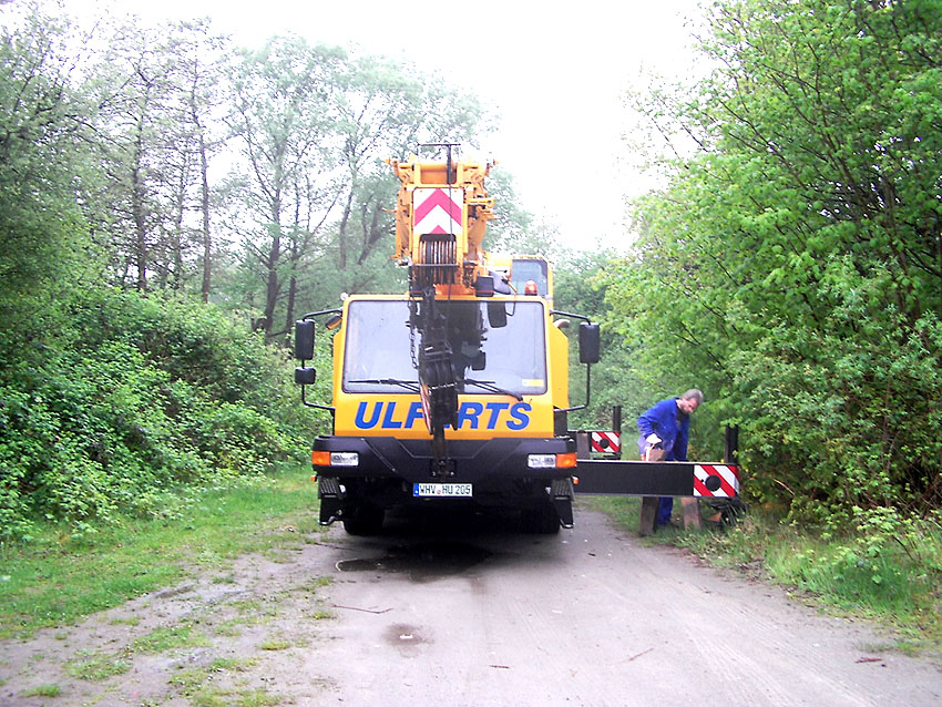 Es ist geschafft. Heute zwischen 8 und 13 Uhr wurde die Zelle von Klein Wangerooge zum Minsener Oog 1A umgebettet. Die immens lange Zeit kam deshalb zustande, da ein großer Betonbrocken wider Erwarten das Heben der Zelle verhinderte. Also musste sie dann aus ihrem Liegeort hinaus gezogen werden. Auch wog die Zelle unerwartet viel: 7 Tonnen! Das Wetter war leider regnerisch, aber alles in allem hat die Aktion dann im weiteren Verlauf relativ gut geklappt. Die Zelle wurde heute bereits ein wenig gesäubert und das Hinweisschild angebracht. Sie steht leicht schief auf dem Fundament, dieser Makel wird sich hoffentlich mit der Zeit von selbst korrigieren. Auch wurde bereits aufgrund einer Furche im Beton nachgewiesen, dass es sich definitiv um die Zelle handelt, welche Herr Klose 1974 abgelichtet hat.