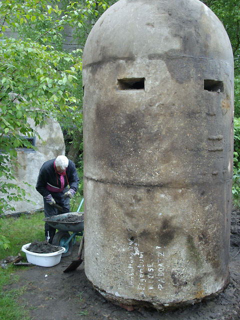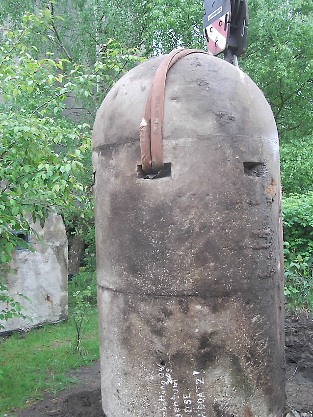 Neuester Stand: Wahrscheinlich keine Westermann-Zelle, sondern Splitterschutzzelle Fabrikat Klöckner / Klöckner-Stahlwerk Osnabrück / gefertigt im Zementwerk Piesberg / kleine Bauform / 25 cm Wandstärke / RL 3-43/41