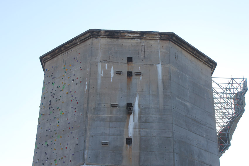 - Dieser im Krieg teilweise ziegelrot bemalte LS-Turm wurde unter anderem zur Tarnung äußerlich wie ein regulärer Wasserturm gestaltet. Unter der Dachspitze zu sehen ein Beobachtungsstand. An der Wand ist außen eine Pegelstand-Anzeige mit Überlauf zu sehen, denn der Turm diente reell neben dem Luftschutz teilweise als Not-Wasserturm für die Versorgung der nahen Reichsbahnanlagen (Wasserbehälter im Turm-Oberbereich). An der Turmwand außerdem erkennbar Einschlagsschäden durch Tieffliegerbordmunition. Deren Piloten hielten das Objekt wohl tatsächlich für einen "normalen" Wasserturm und werden ziemlich überrascht gewesen sein, dass das Objekt derart widerstandsfähig war... -