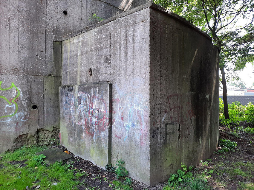 Kleiner Bunker (rechts) unmittelbar nördlich des Hochbunkers Humboldtstraße / Rutenbergstift (hinten links).