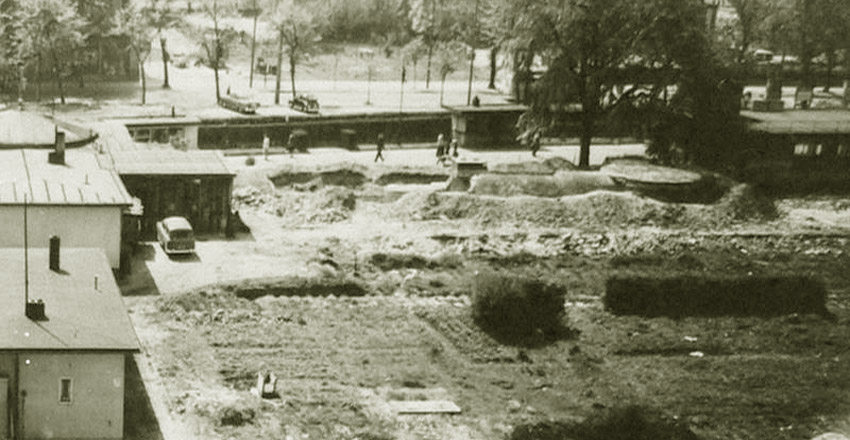 Herzbruchstollen Bahnhofsvorplatz / Der teilweise freigelegte Stollen von der Seite aus Norden. Die Abrissarbeiten haben bereits begonnen. Ein Teil der Stollenröhre ist schon abgebrochen. Zu erkennen der runde Hauptbunkerkörper am Westende des Bauwerkes (rechts im Bild). Eventuell besaß die Anlage einen zweiten runden Hauptbunkerkörper an der Ostseite (dieser hätte sich dann etwa an der linken Bildseite wohl in Höhe des runden Nachkriegspavillons befunden / wurde dieser dann gar auf den Rundkörper gesetzt?). Etwas weiter links des ersichtlichen Rundkörpers einer der Notausstiegsaufbauten (wenn es denn mehr als einen davon gab).