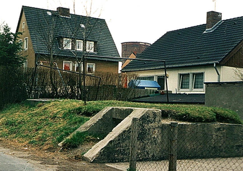 Am Tonndeichsweg in Wilhelmshaven existiert noch heute im überbauten Zustand ein Erdbunker. Eine weitere Quelle beschreibt diesen Bunker als Herzbruchstollen mit 60 Plätzen. Zumindest der auf dem Bild erkennbare Eingangsbereich sieht denen der Herzbruchstollen äußerst ähnlich. Wenn dies ein Herzbruchstollen ist, warum hat er dann keinen runden Bunkerkörper hinter dem Eingang? Der Verdachtsbunker besitzt nach unseren Erinnerungen zwei Eingänge und ist heute bis auf die oben erkennbare Außenwand nicht mehr einsehbar. Oder ist eventuell der Betonbereich hinten links, auf dem die hintere Wäschestange leicht abgesackt steht, der runde Bunkerkörper?